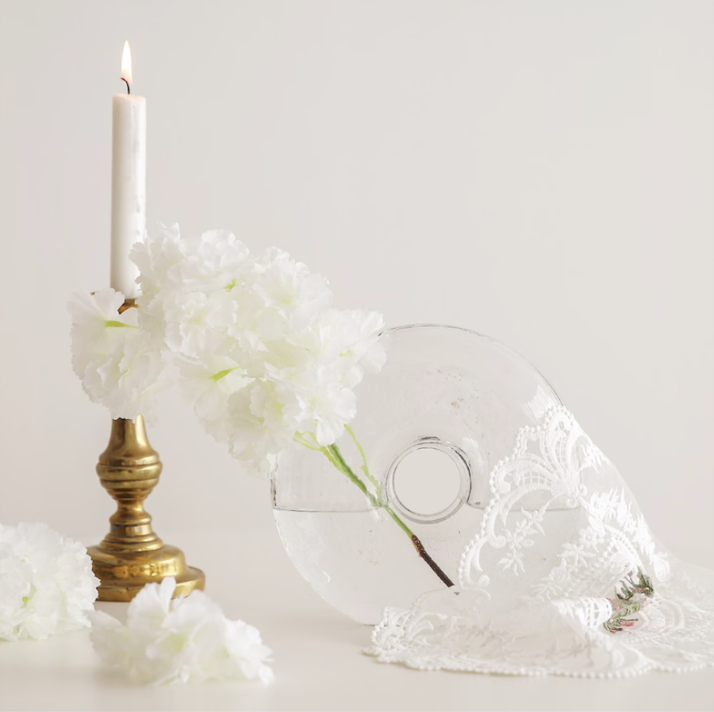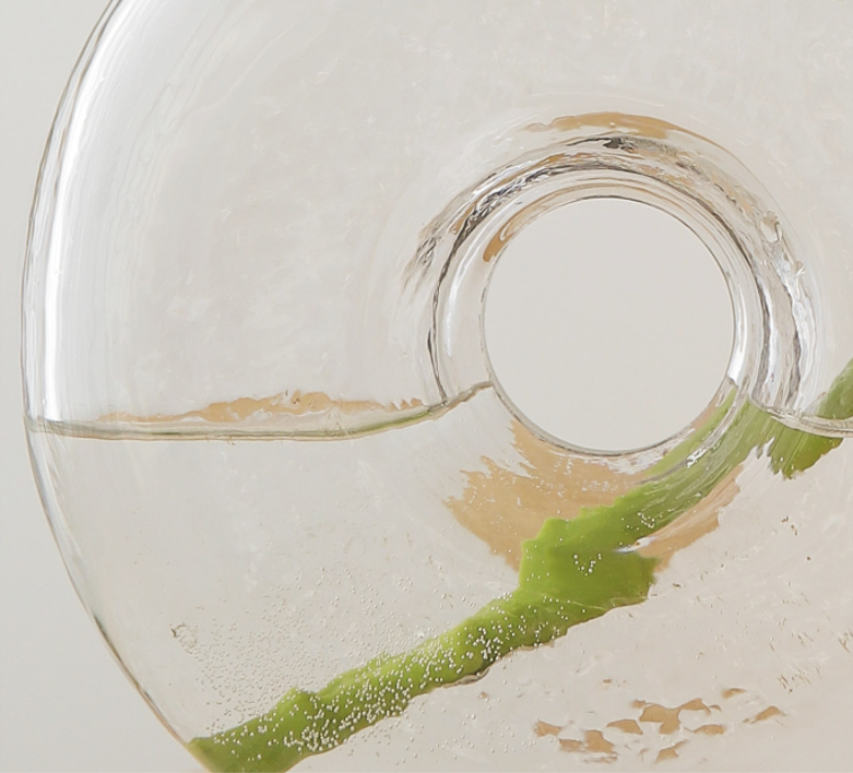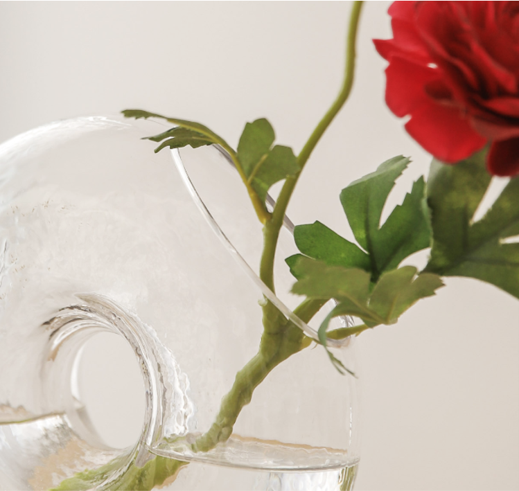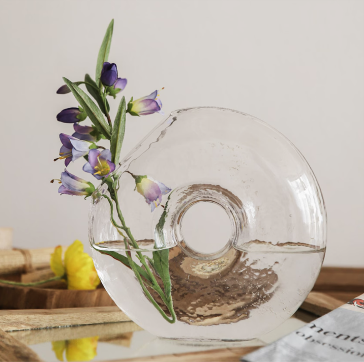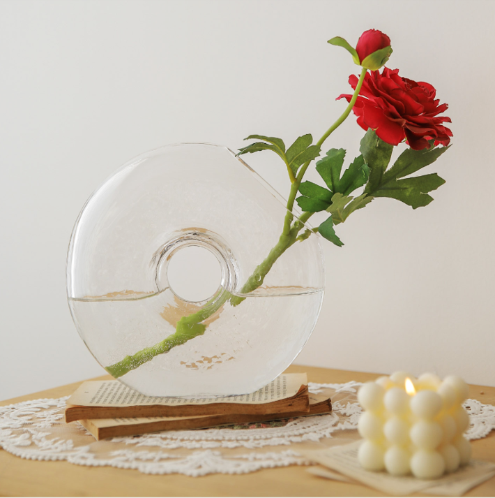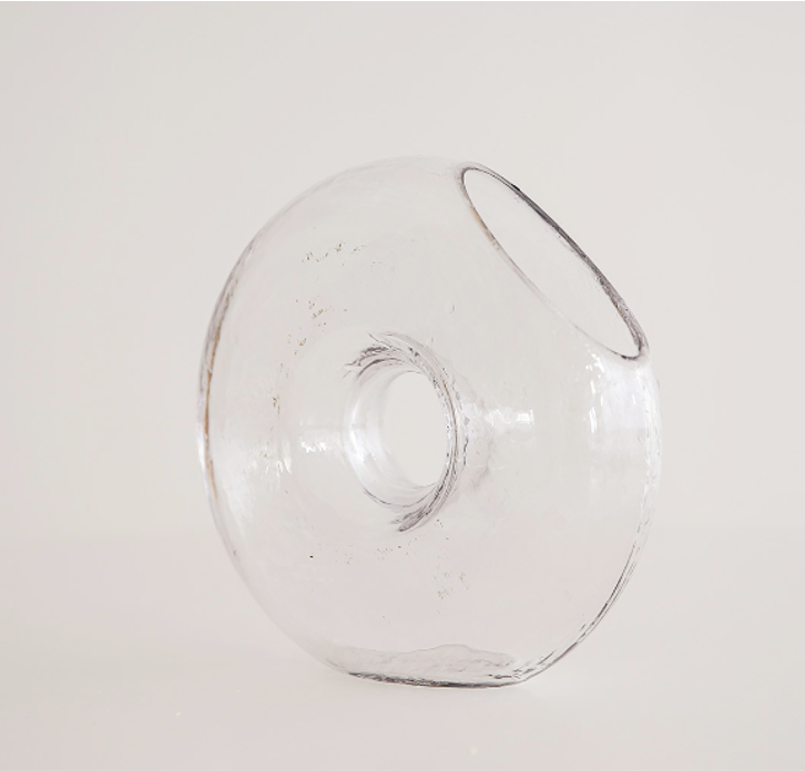ドーナツ型のユニークなフォルムが目を引く、透明ガラスの花瓶です。