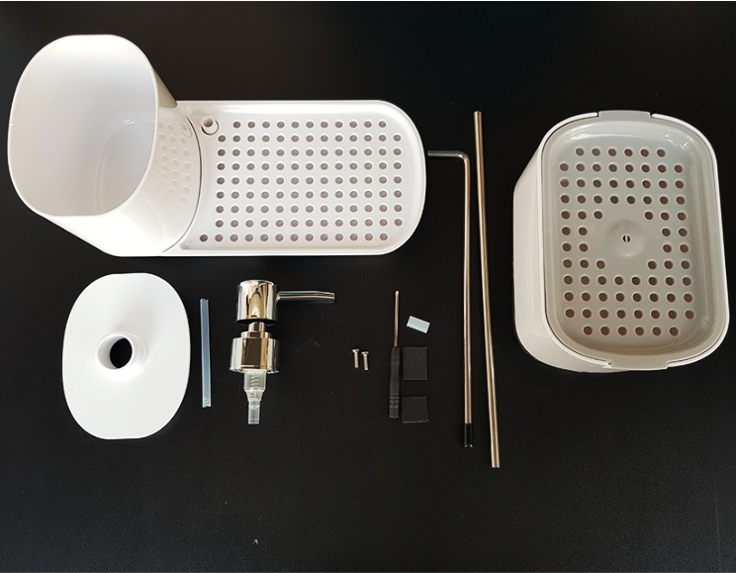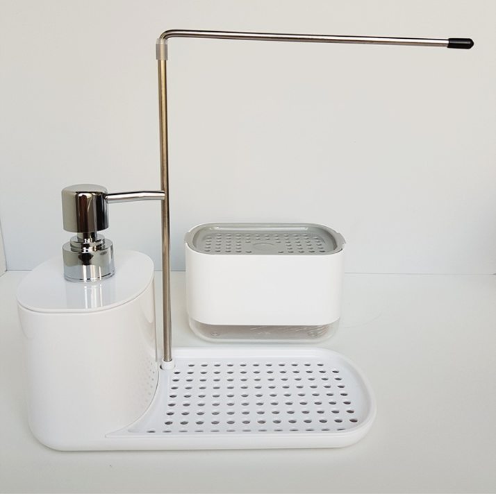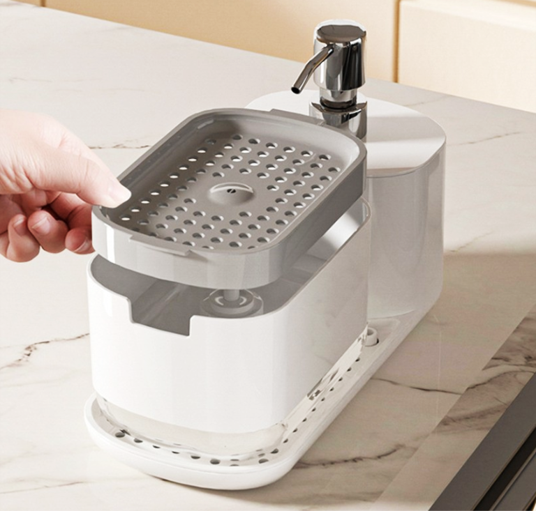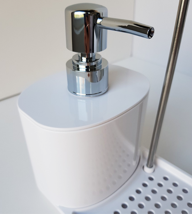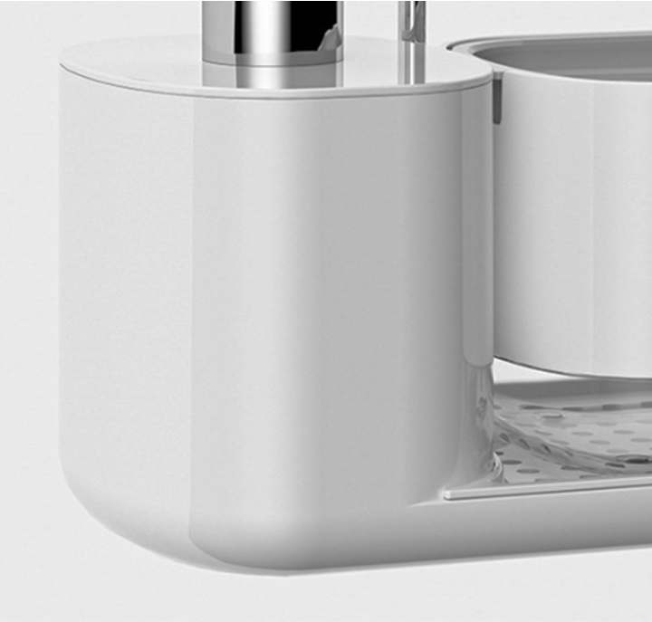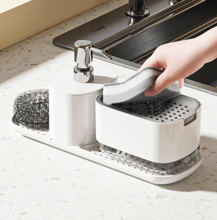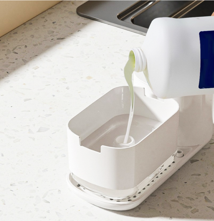 キッチンの洗剤やスポンジをすっきり収納できる、多機能ディスペンサー付きホルダー。