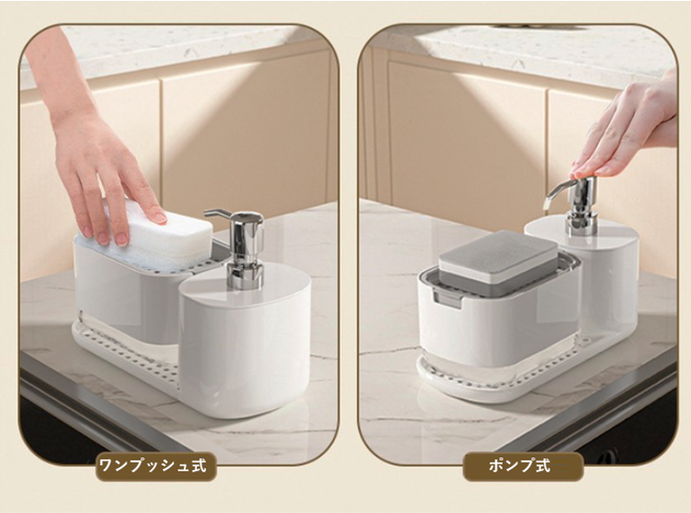 スポンジを台座に押すだけのワンプッシュ式と、ポンプ式の2タイプで使い分け可能。