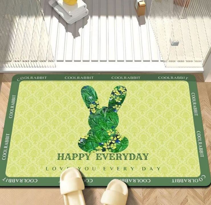 かわいらしいウサギと花柄が目を引く、機能性とデザイン性を兼ね備えた珪藻土バスマット。