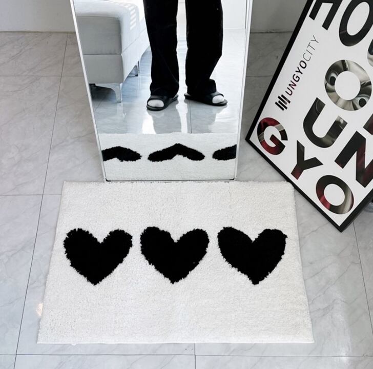 白黒のハート柄が目を引く、かわいくて実用的なミニ床マット。
