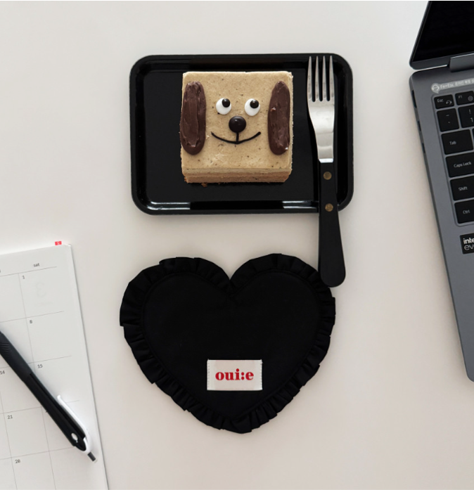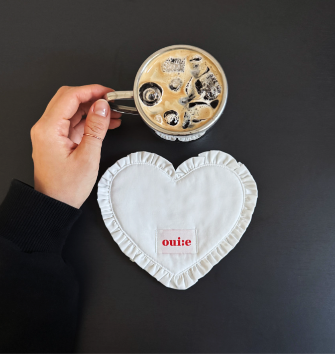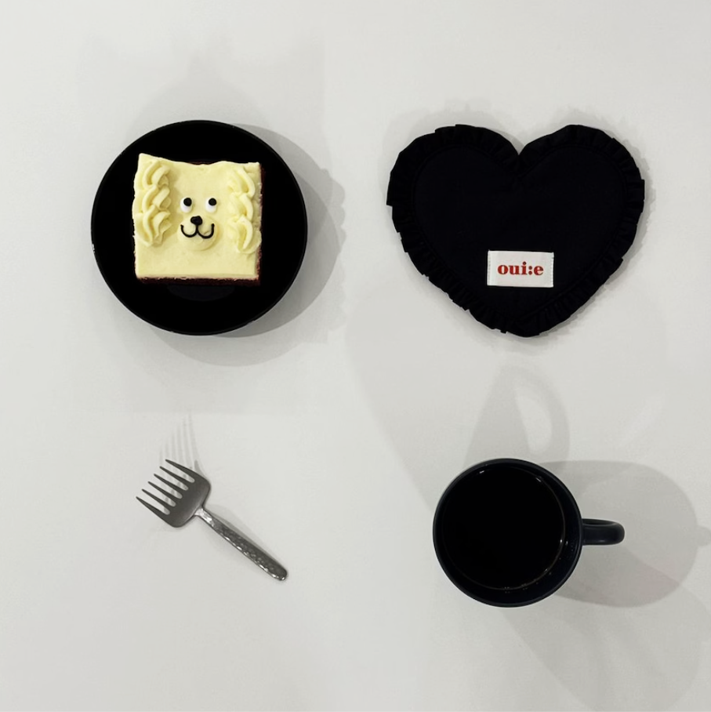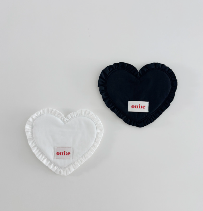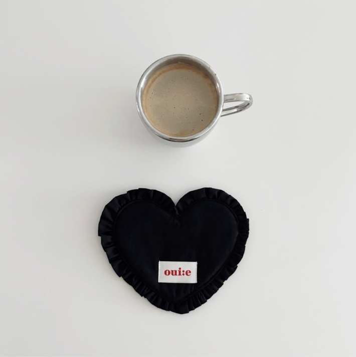 ハート型フリルが愛らしい、ブラックとホワイトのファブリックコースター。