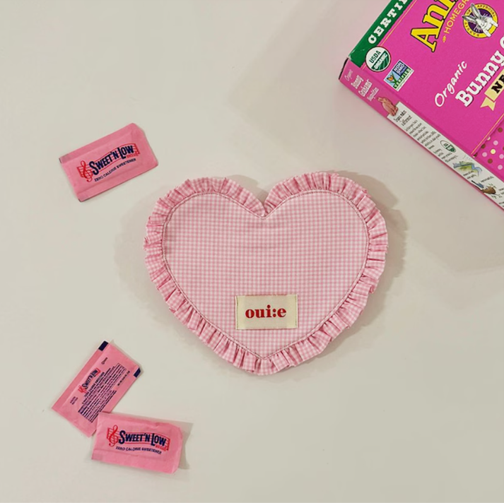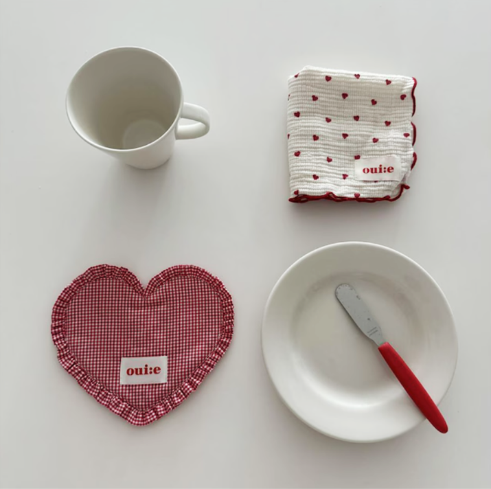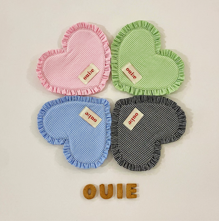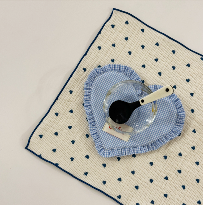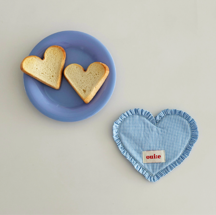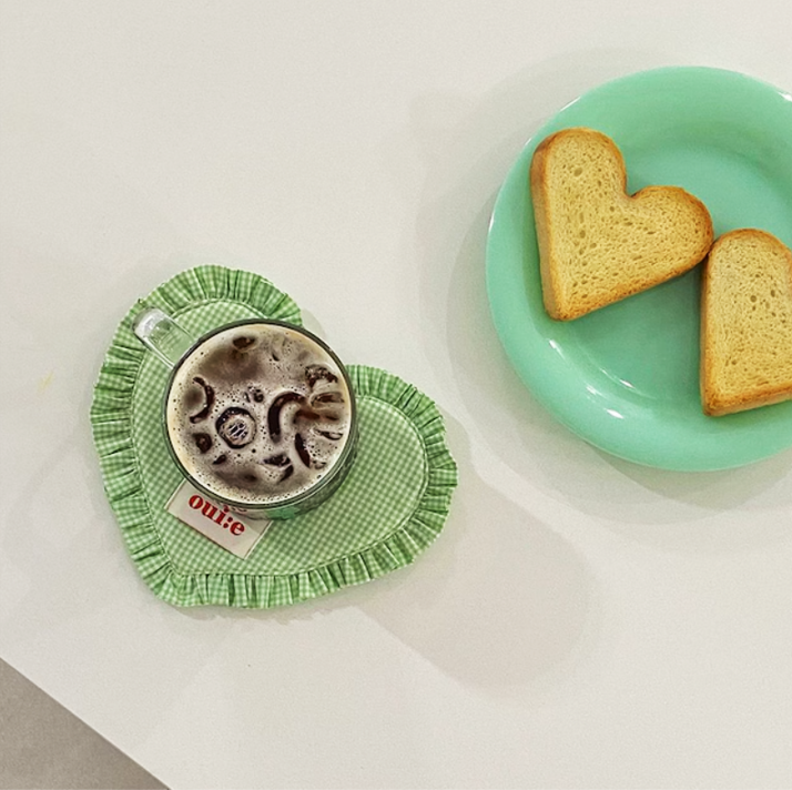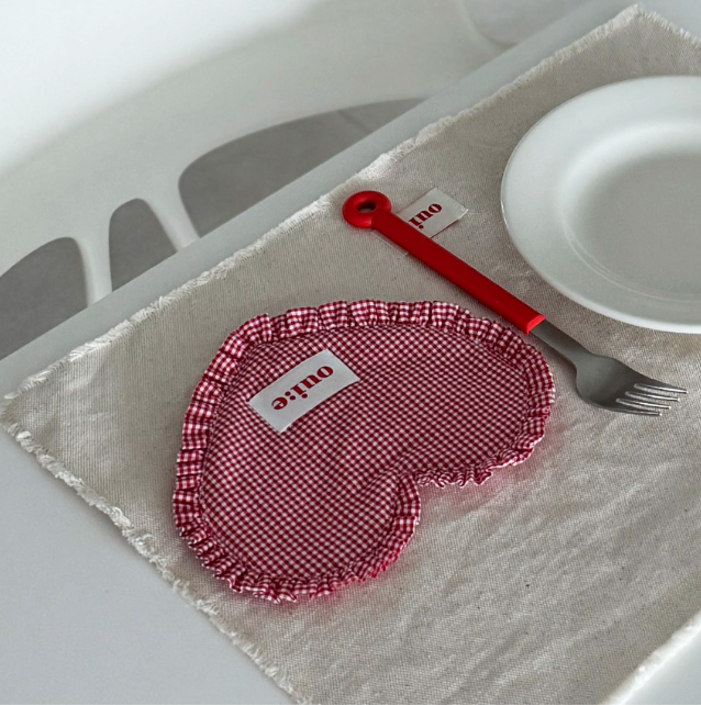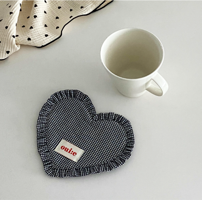 ギンガムチェック柄とハート型フリルが愛らしい、ファブリックコースター。
