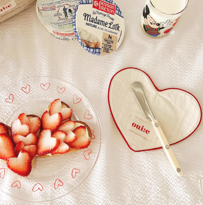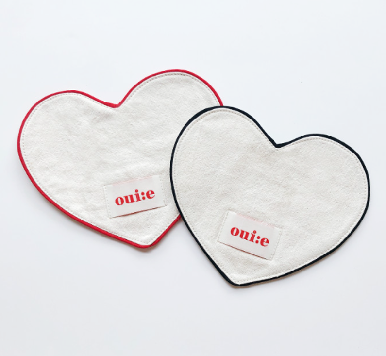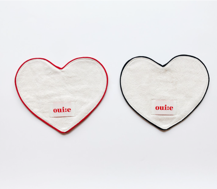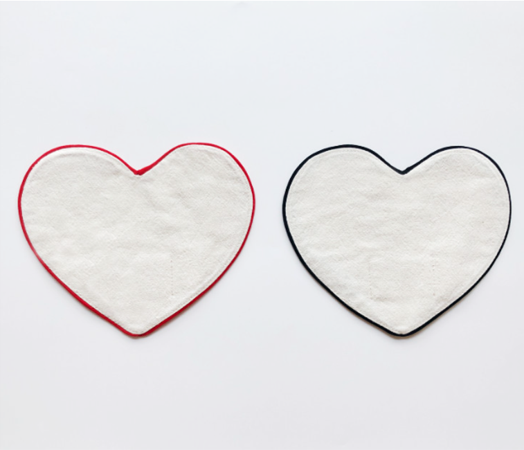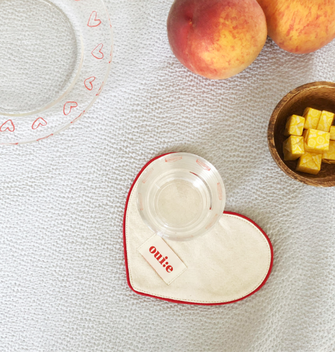 アイボリー生地にレッドとブラックのラインが映える、ハート型ファブリックコースター。