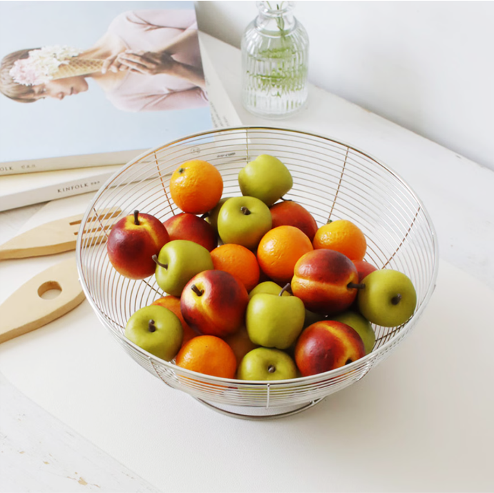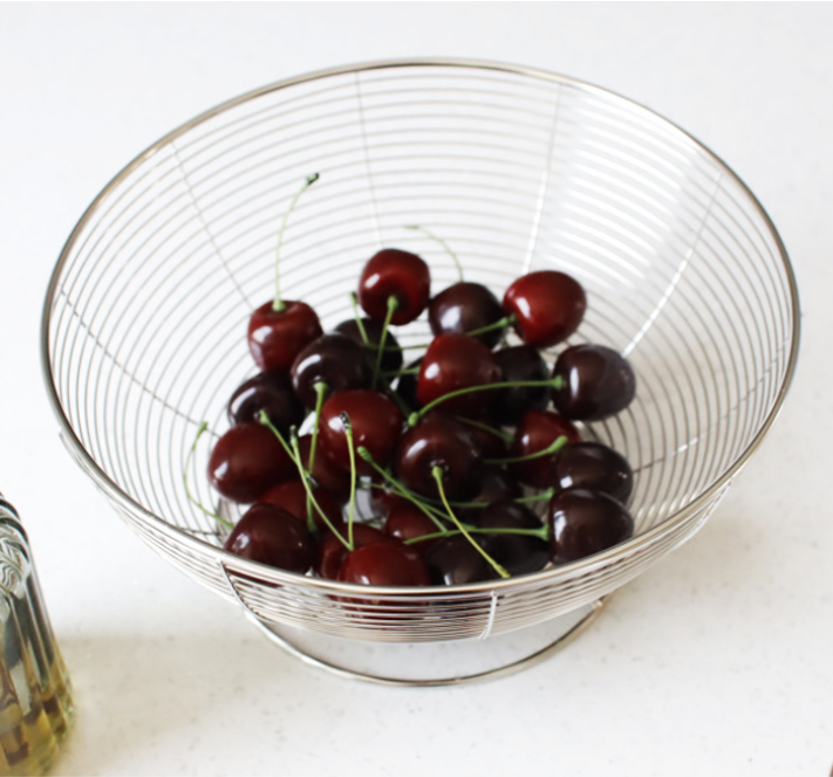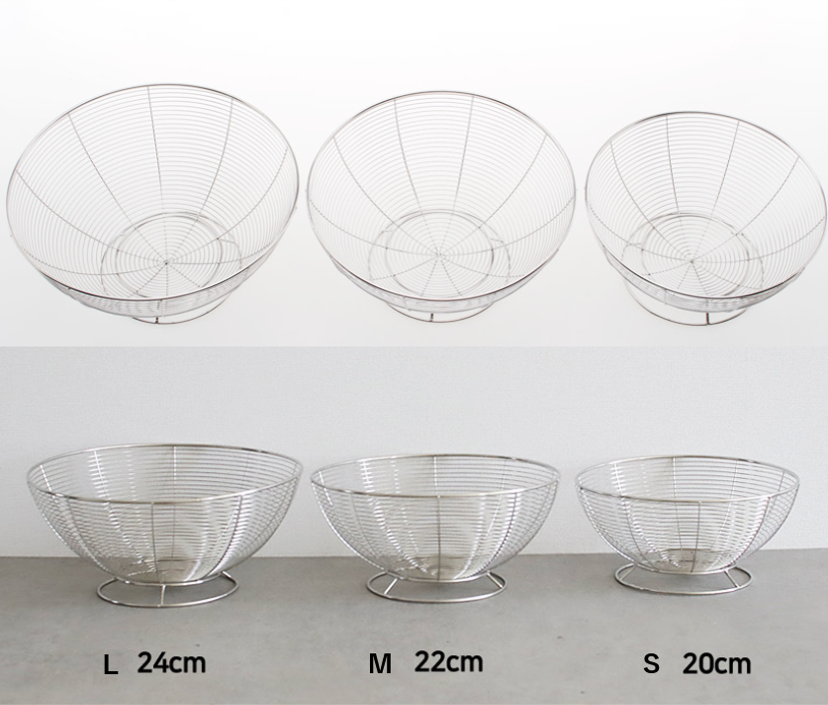 シルバーのステンレススチールで仕上げた、円形ワイヤーバスケット。