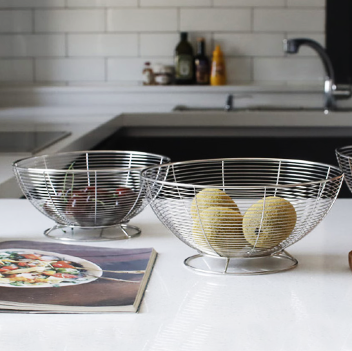 シルバーのステンレススチールで仕上げた、円形ワイヤーバスケット。