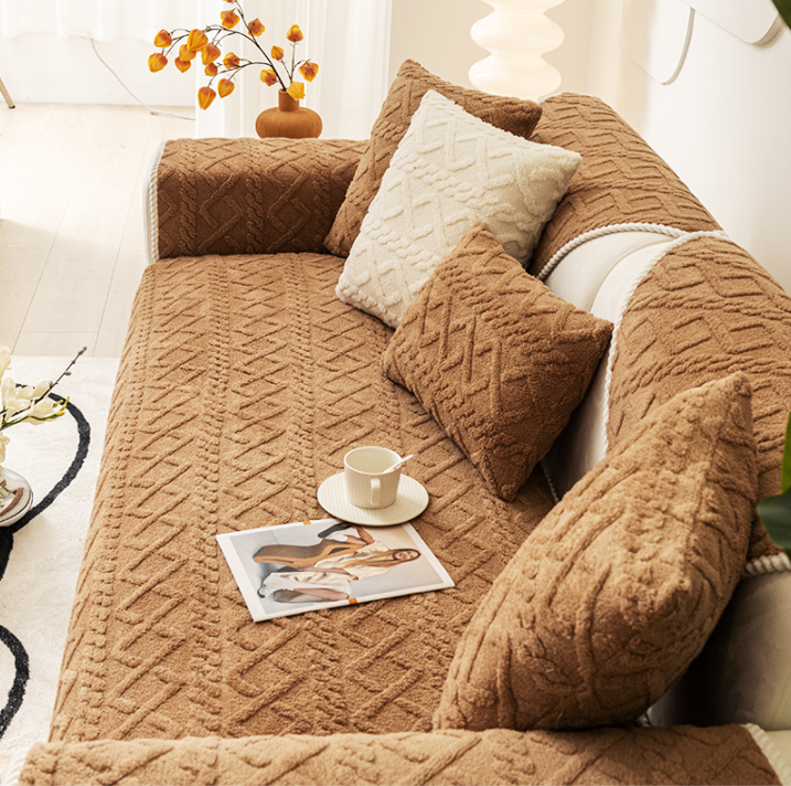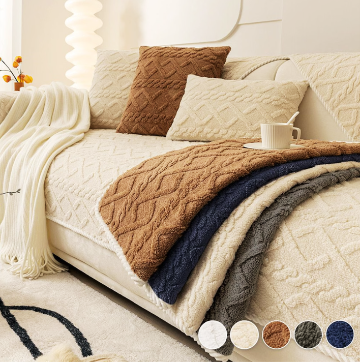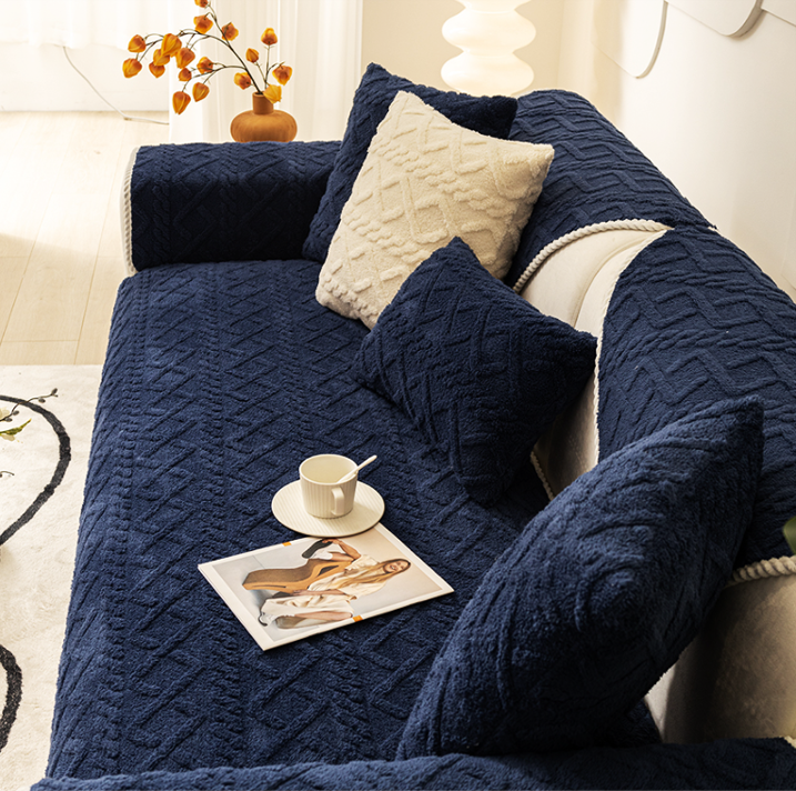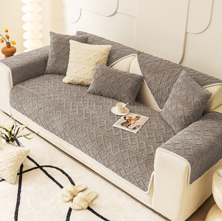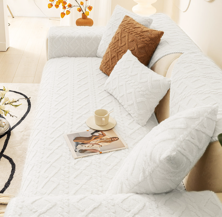 ふわふわの極細糸で編まれた、北欧風ニットパターンのソファパッド。