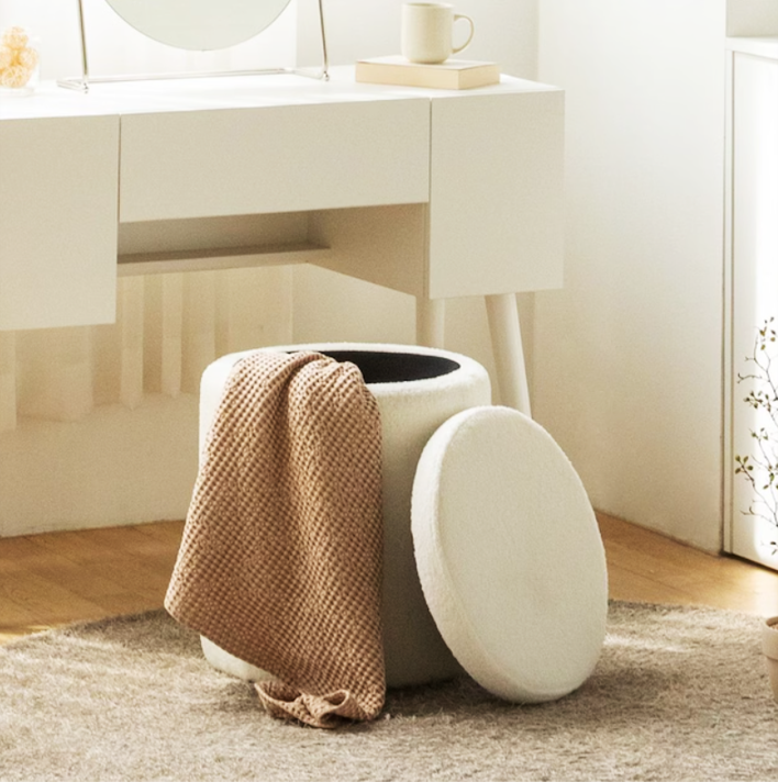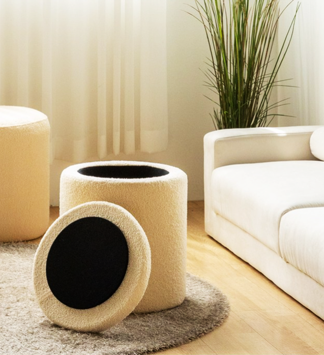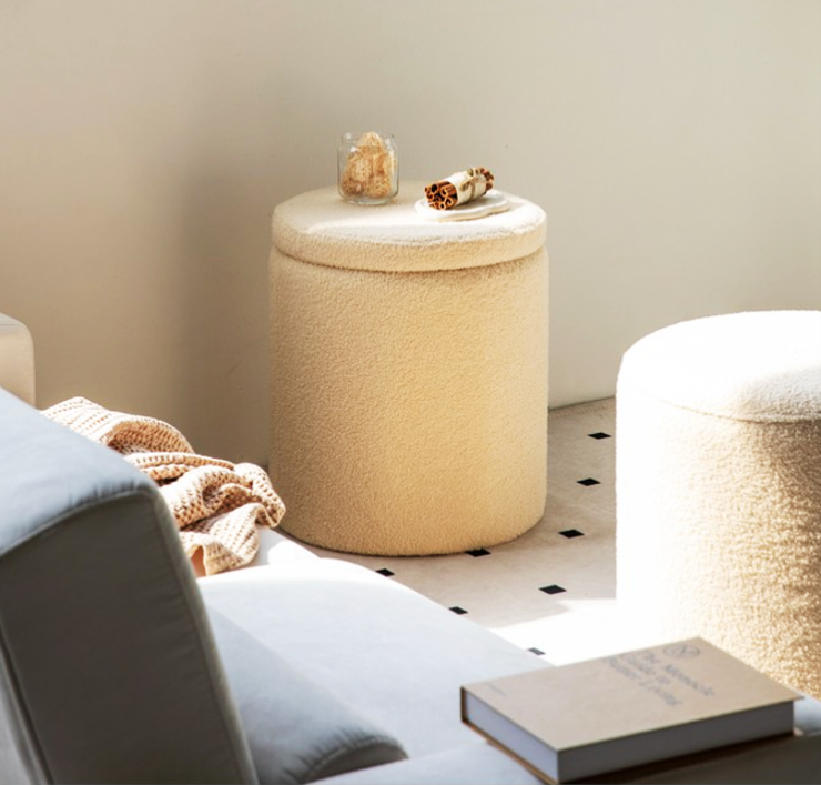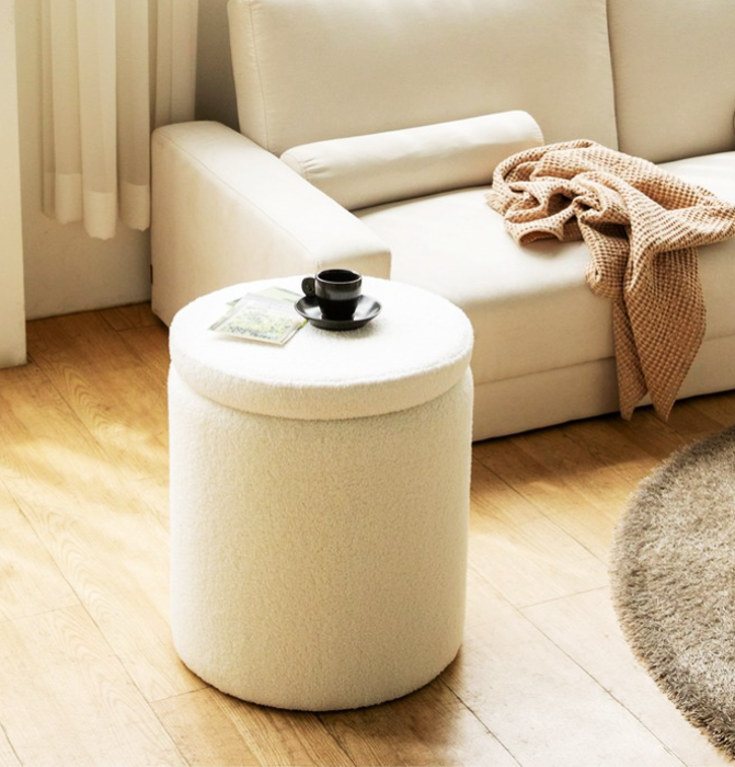 ふわふわのブークレ生地が心地よい、丸型のファブリックスツール。