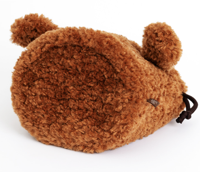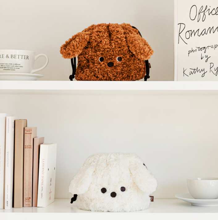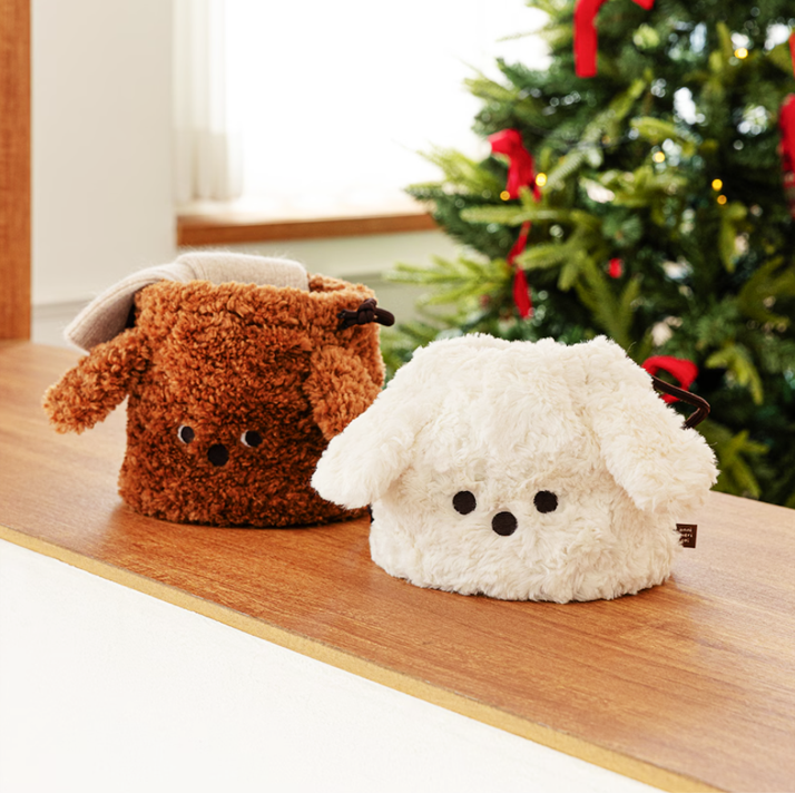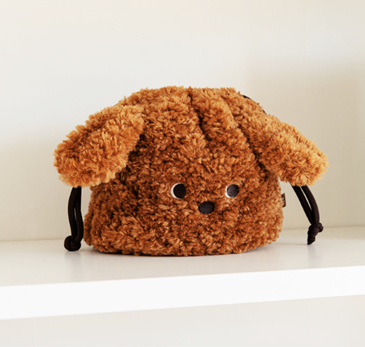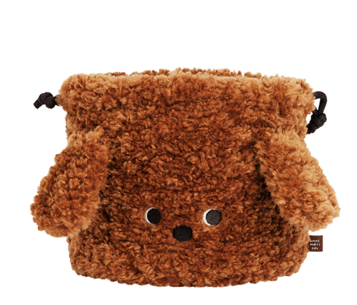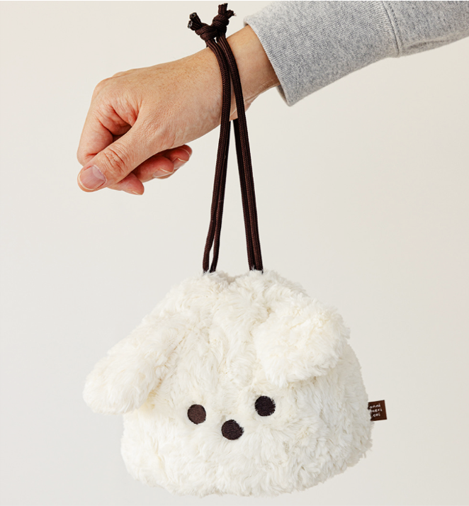 ふわふわ素材と耳付きデザインが愛らしい、子犬モチーフの巾着ポーチ。