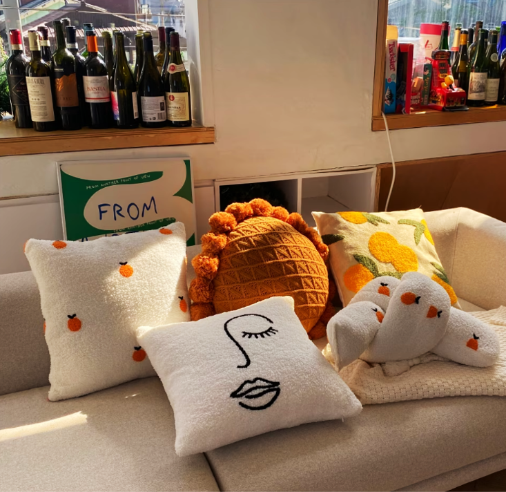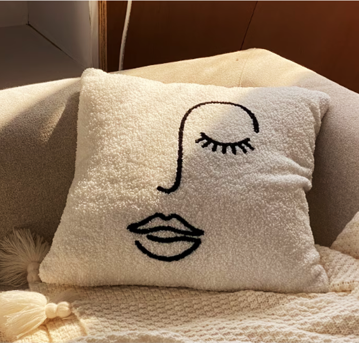 手描き風の顔デザインが印象的な、アート感あふれるソファクッション。