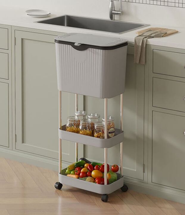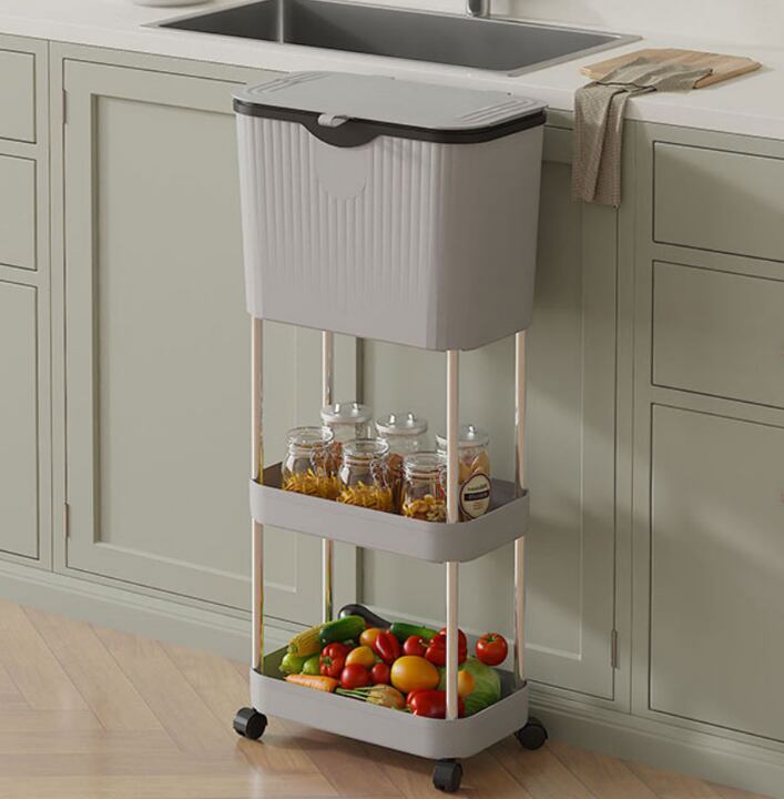 1段目はフタ付きで、小物収納としてはもちろん、ゴミ箱や食品廃棄用としても使える多機能設計。