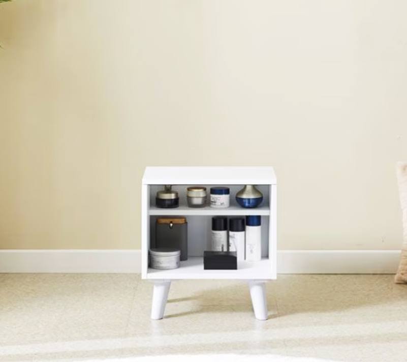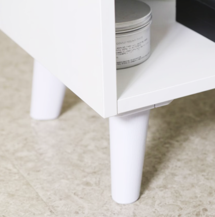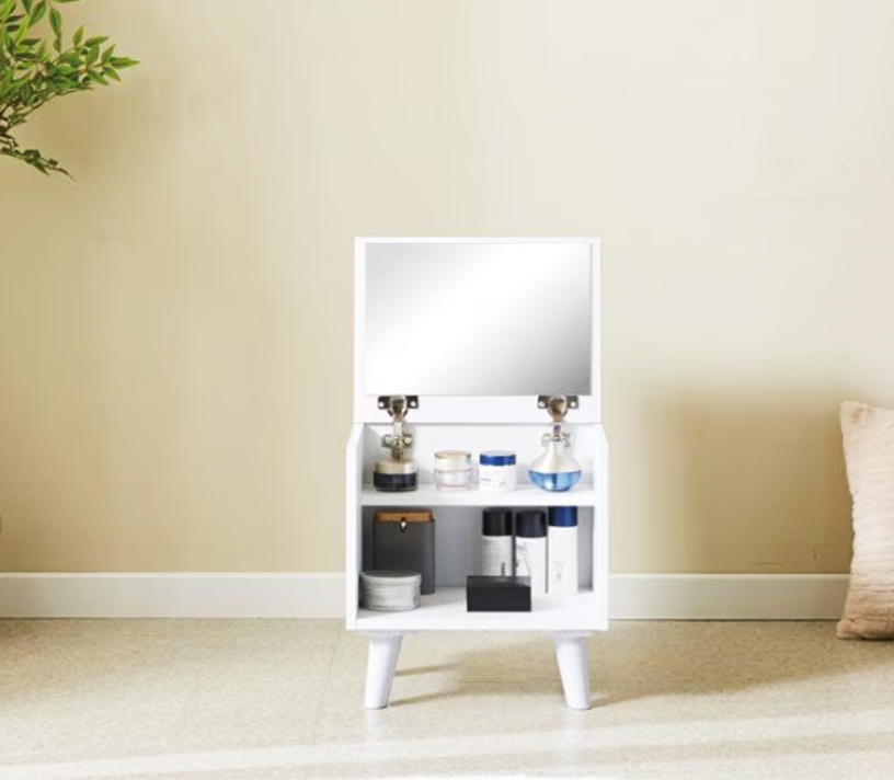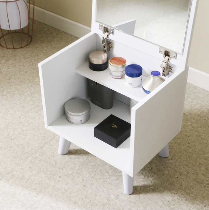 2段収納棚と4本脚の安定感で、化粧品や小物を整理しやすい設計。