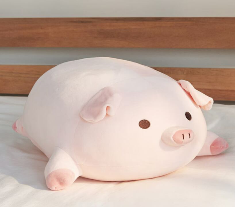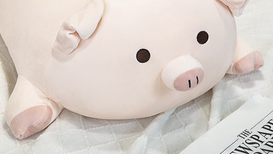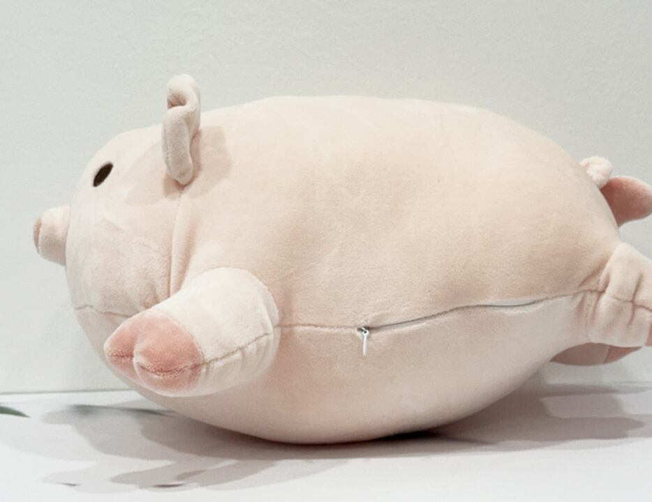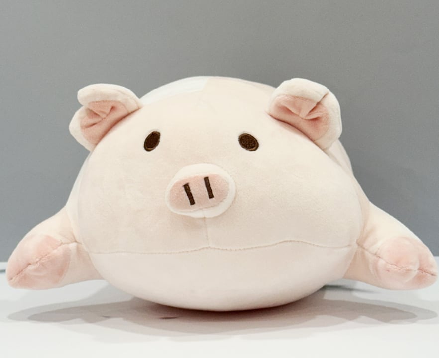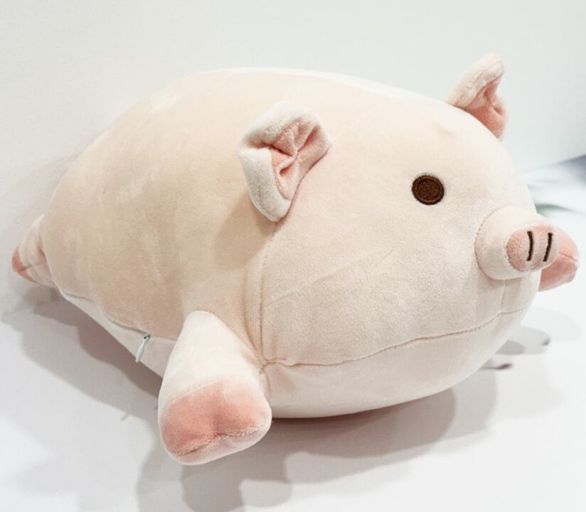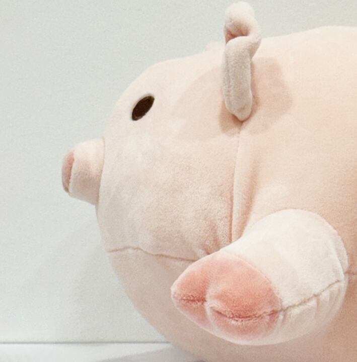 ふんわりとした触感が心をほぐす、癒し系のブタぬいぐるみクッション。