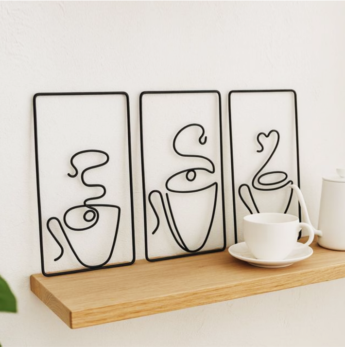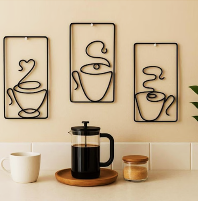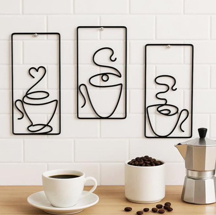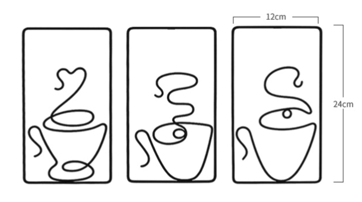 手描き風のコーヒーカップデザインが印象的な、壁掛けアート3点セット。