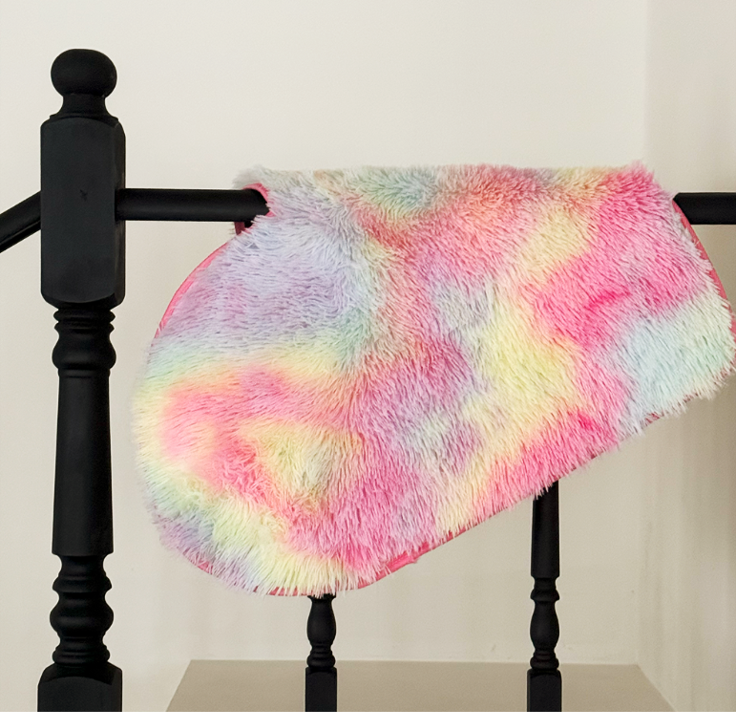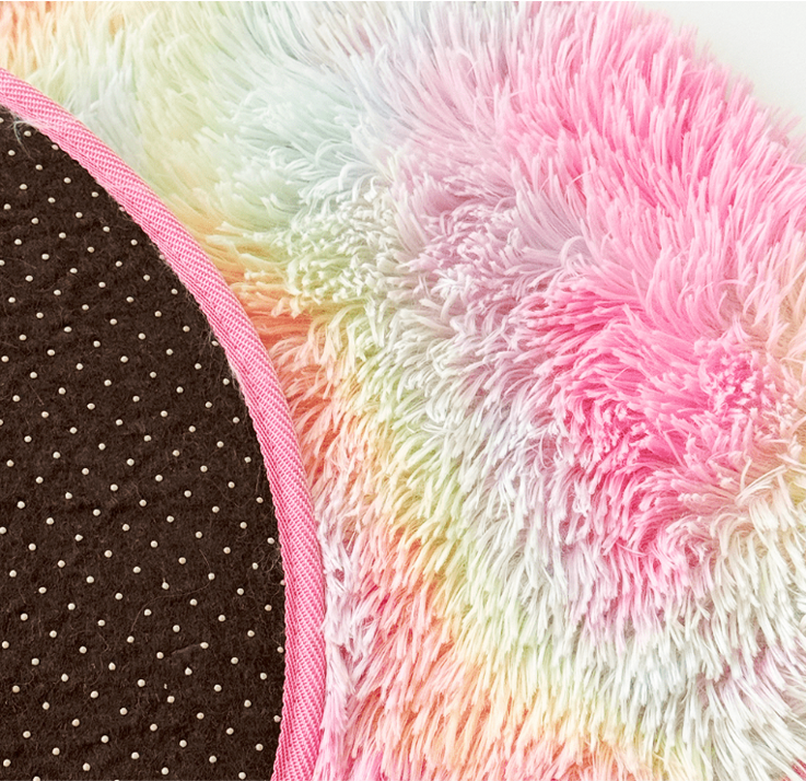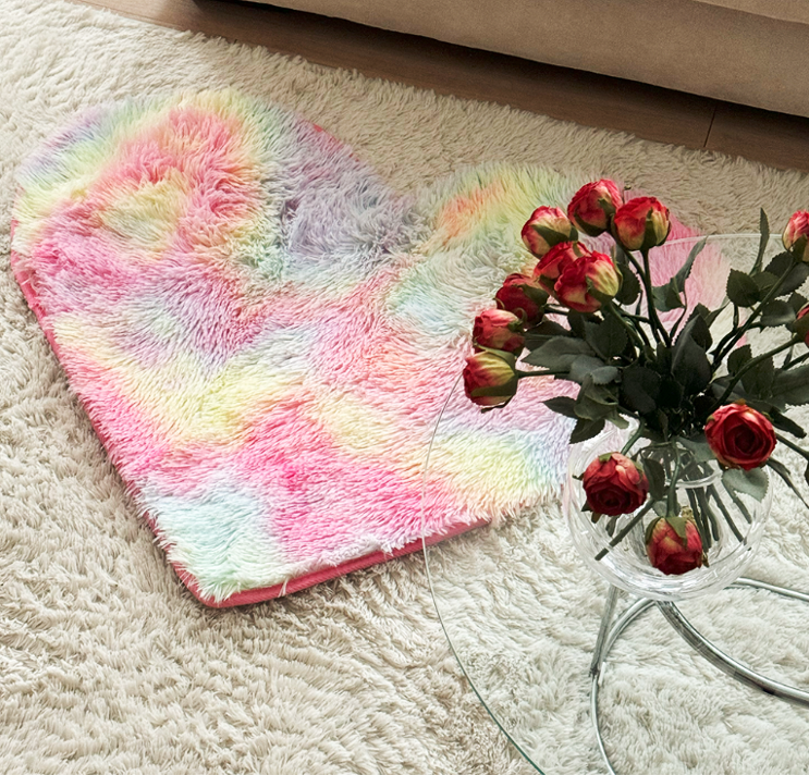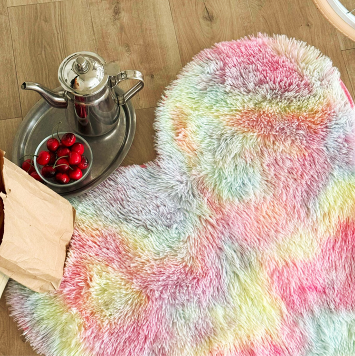 鮮やかなレインボーカラーとハート柄が目を引く、ふわふわのファーラグ。