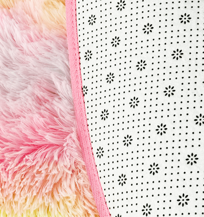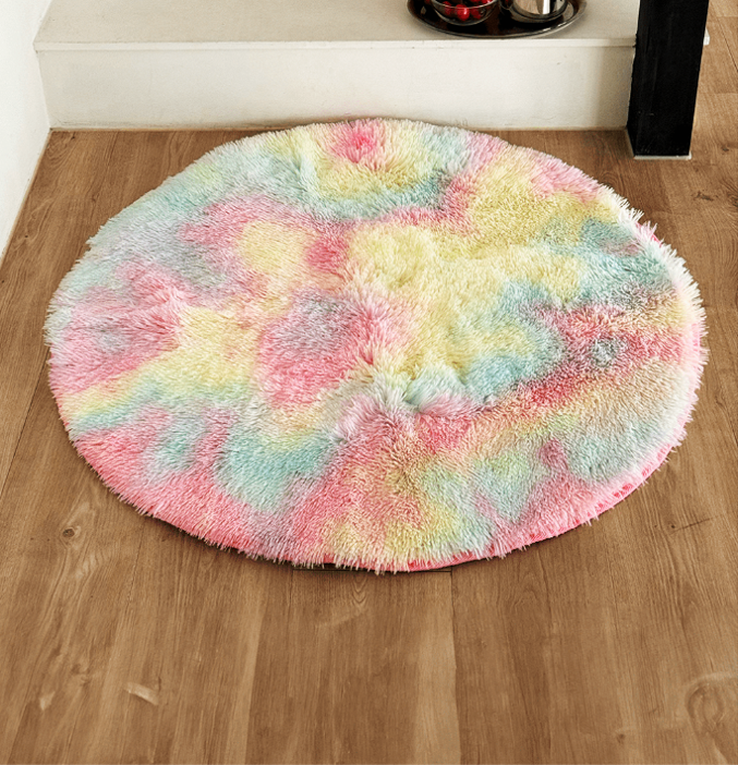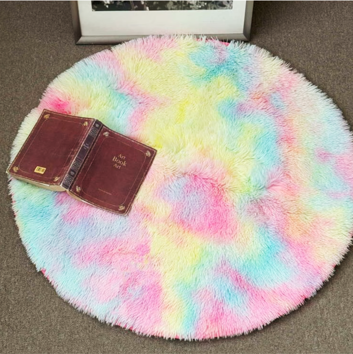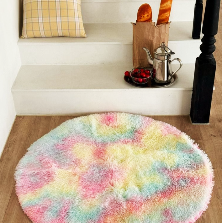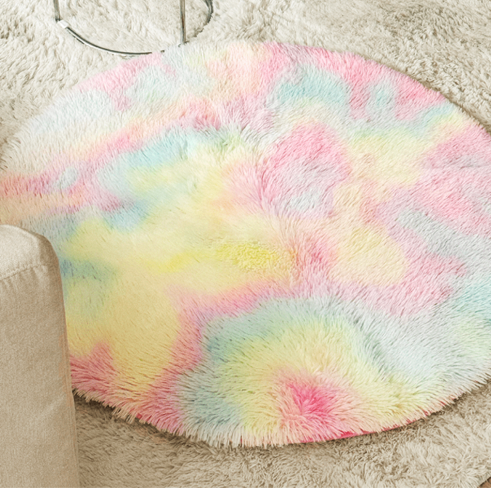 鮮やかなレインボーカラーが目を引く、ラウンド型のふわふわファーラグ。
