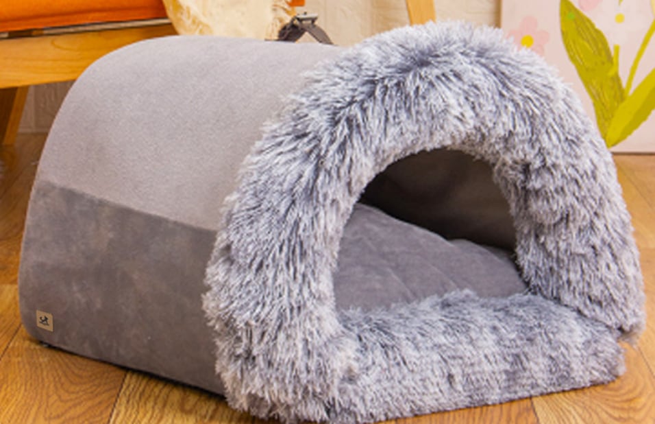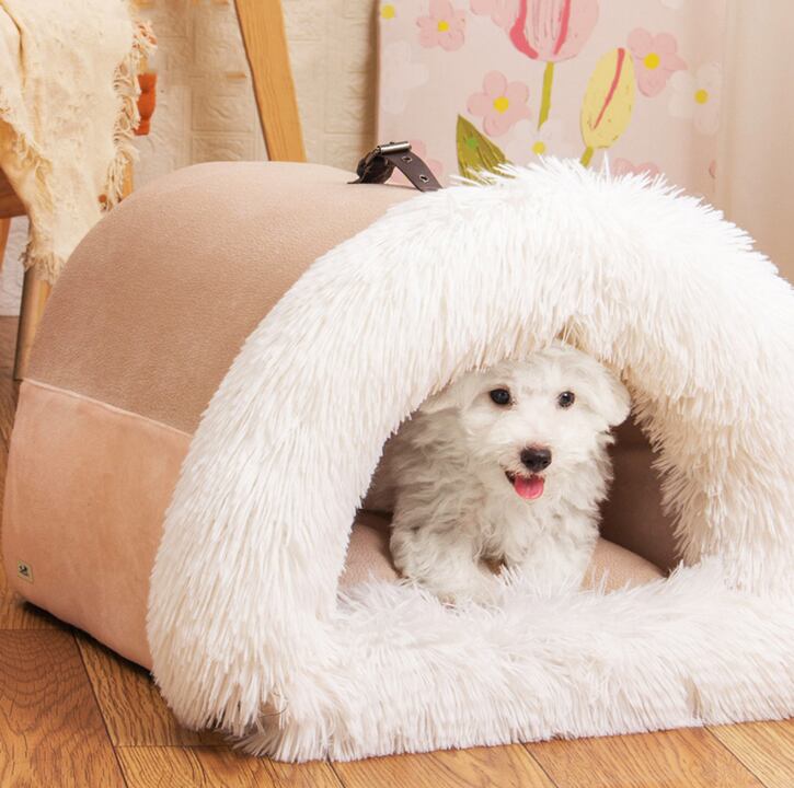 犬猫が安心してくつろげる、もこもこ素材の洞窟型ペットハウスです。