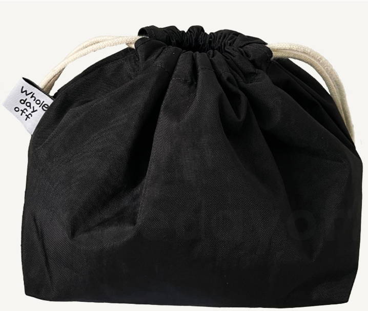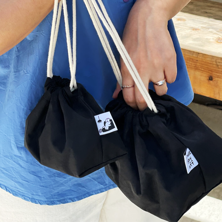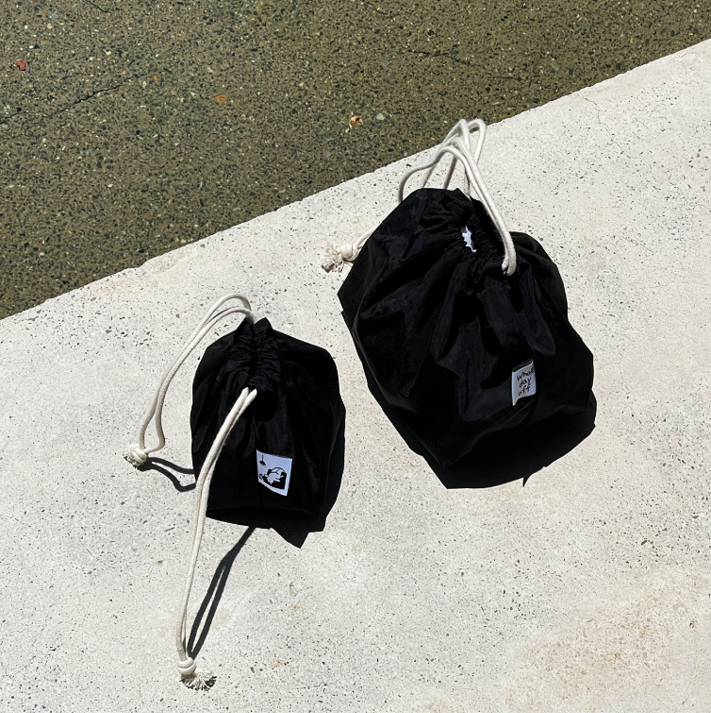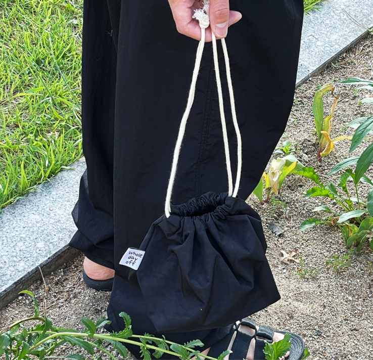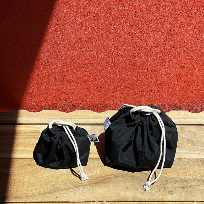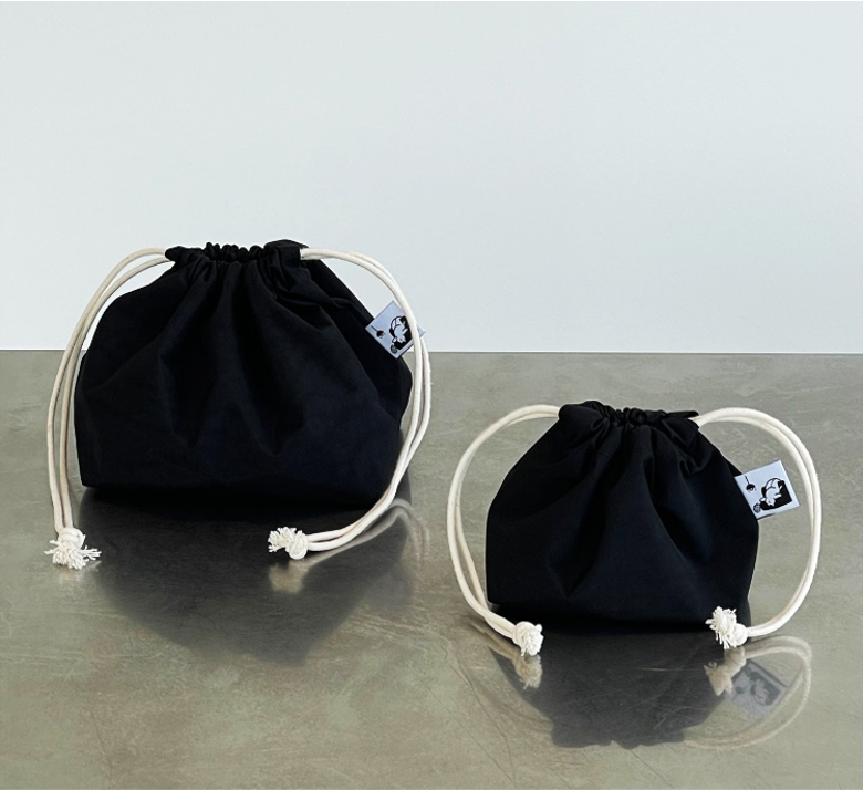 シックなブラックナイロン生地を使用した、毎日の収納に便利な巾着型ポーチです。