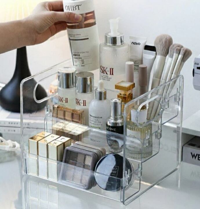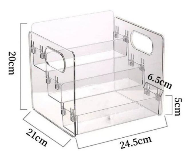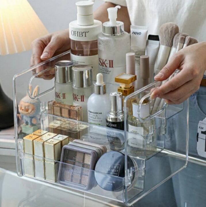3段小物トレイは、透明デザインと持ち手付きの便利さを兼ね備えた多用途収納アイテムです。