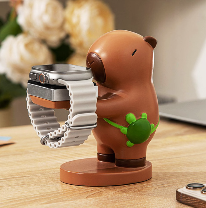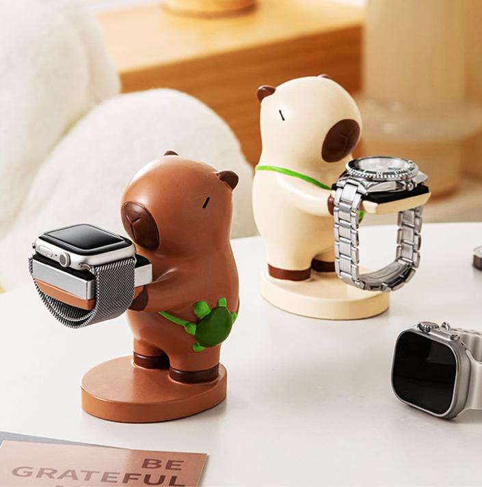 かわいいカピバラのフィギュアが特徴の実用的な時計スタンドです。