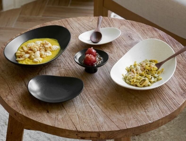 ・非定型の曲線デザイン:柔らかなラインが料理を引き立て、テーブルに動きを生む。