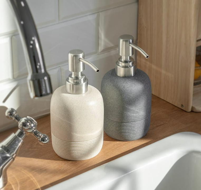 ストーン調デザインがおしゃれな洗剤容器ディスペンサーは、浴室や台所をモダンに彩るアイテムです。