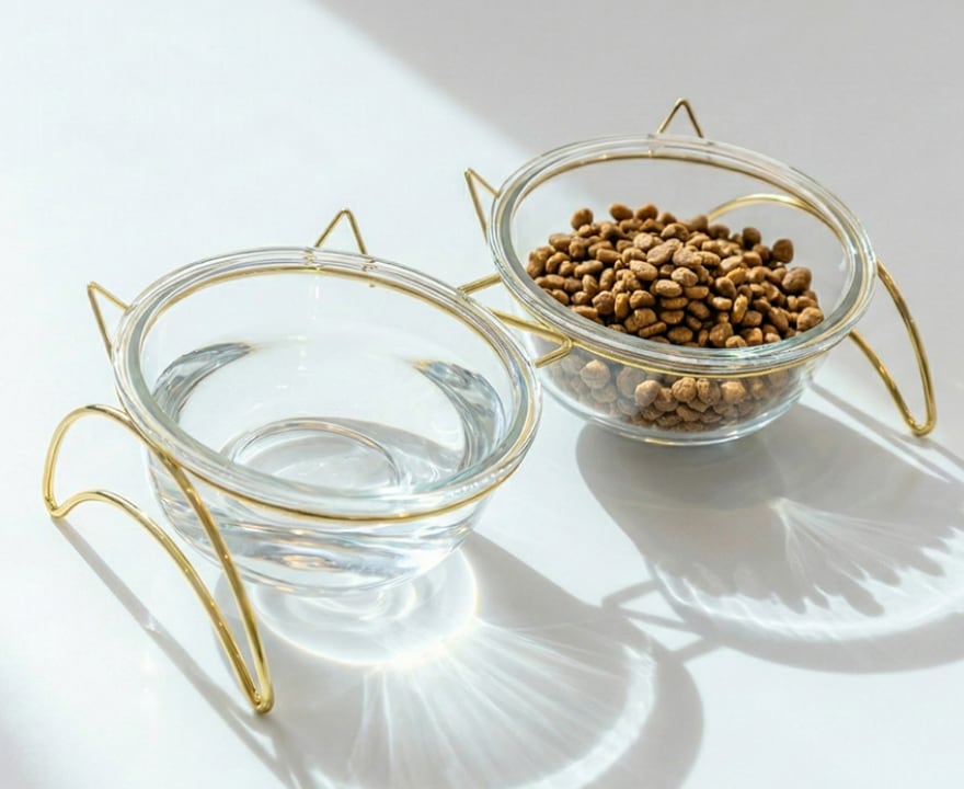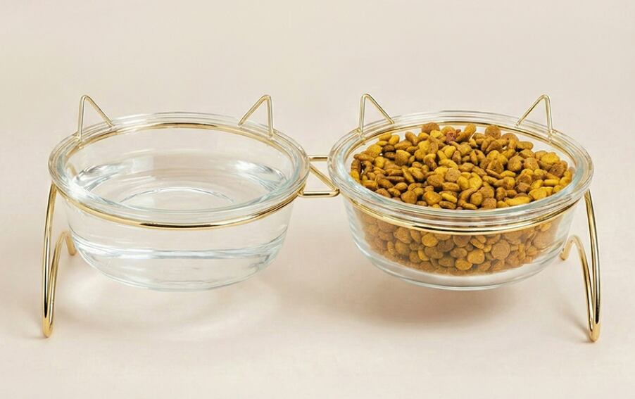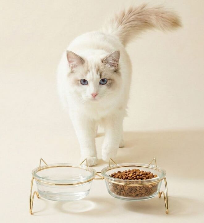 ・透明ガラスボウル:中身が見やすく衛生的で、フードや水の状態を一目で確認できます。