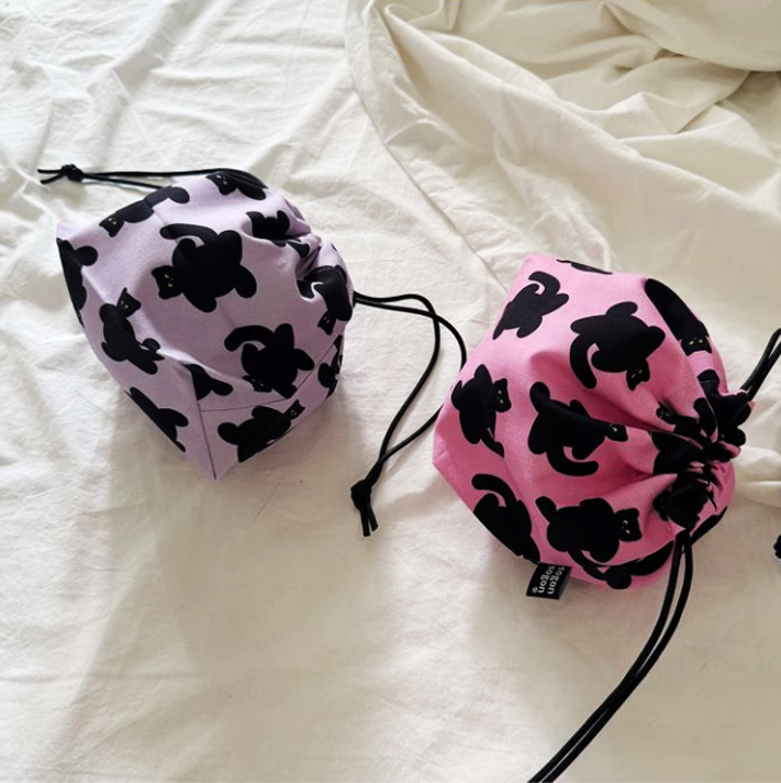 黒猫柄が目を引くかわいい巾着タイプのポーチです。
