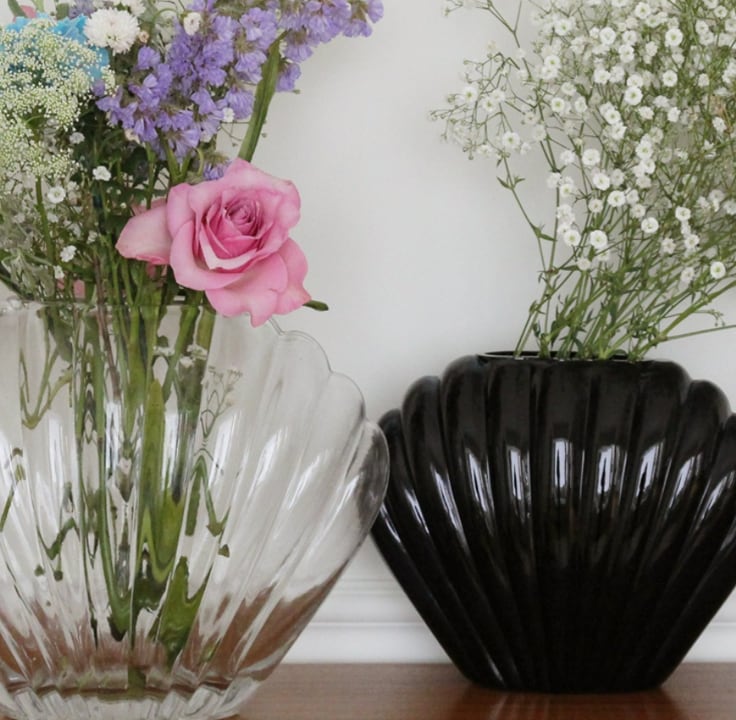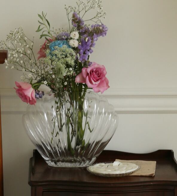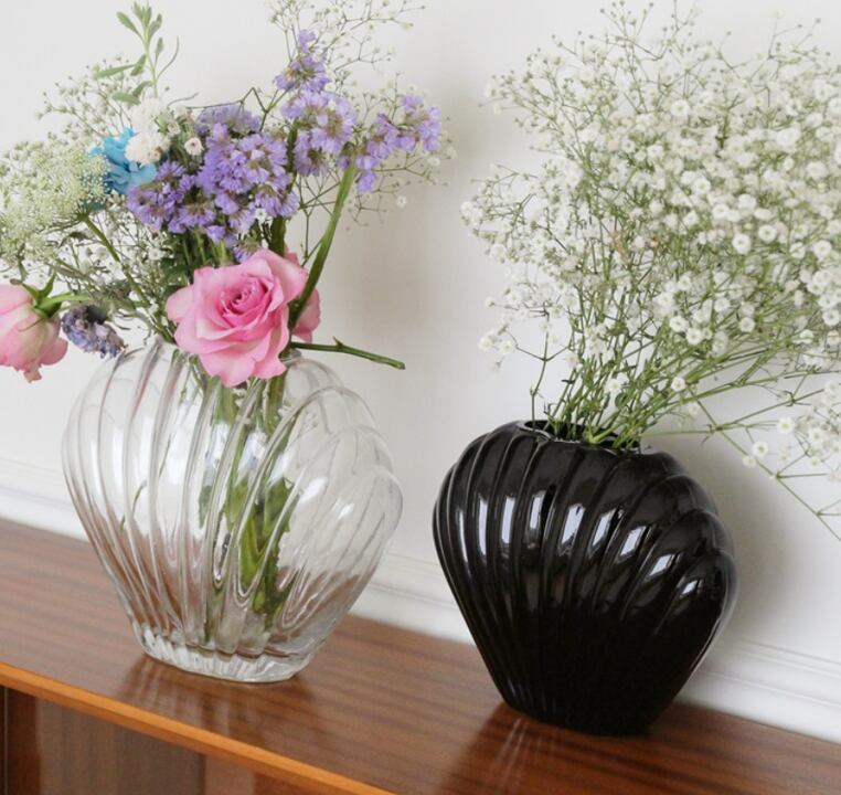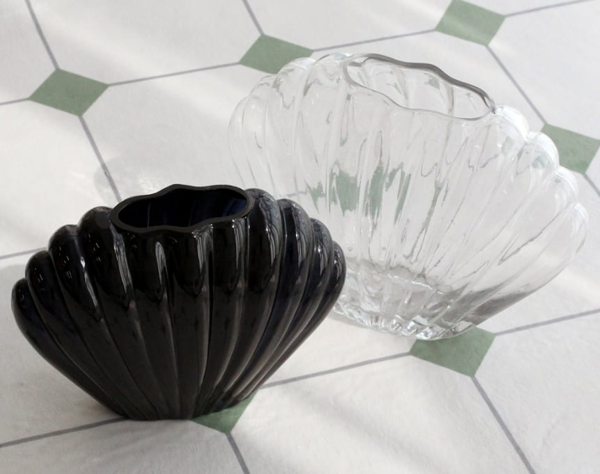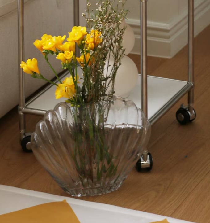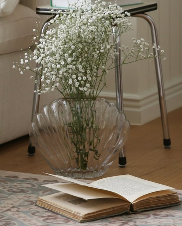 貝殻をモチーフにした花瓶は、透明感のあるデザインが空間に軽やかなアクセントを与えます。