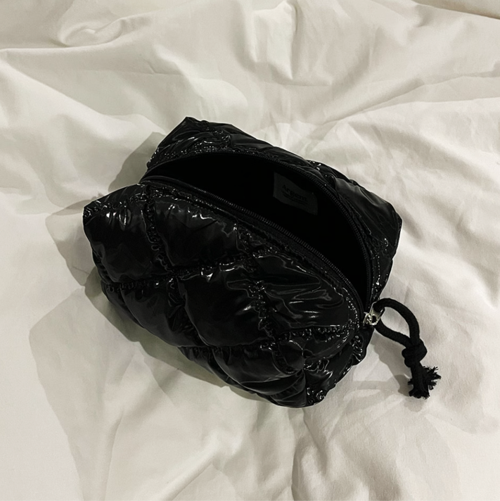 韓国雑貨 スクエアポーチ キルティングブラック 光沢 化粧ポーチ