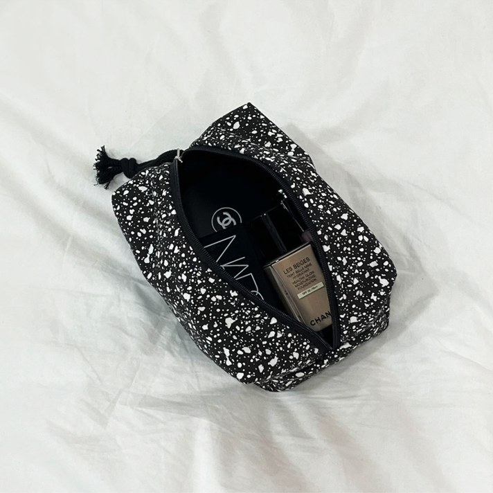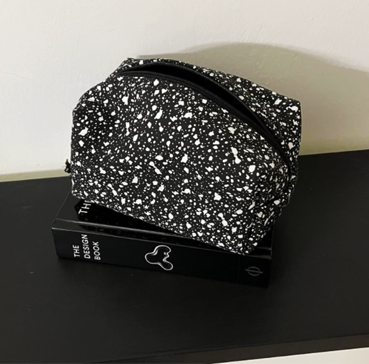 ドット柄がアクセントになったモダンなスクエア型ポーチです。