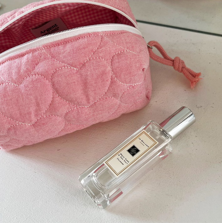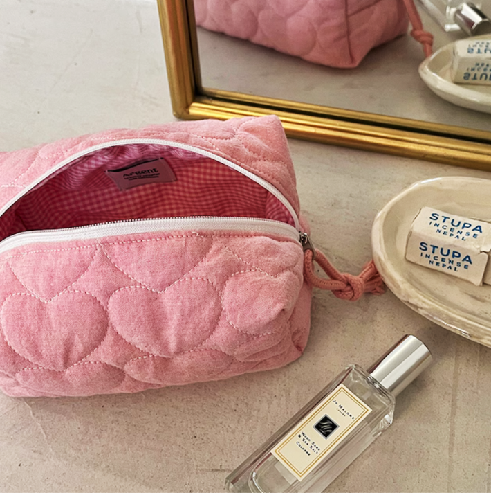 キルティング×ハート柄がかわいさを引き立てるスクエア型ポーチです。