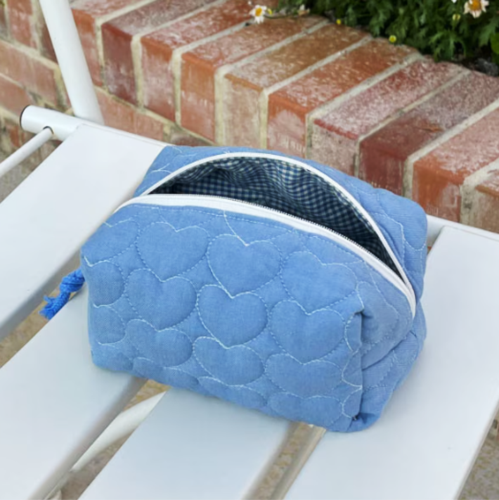 爽やかなブルーにハート柄キルティングを施したスクエア型ポーチです。