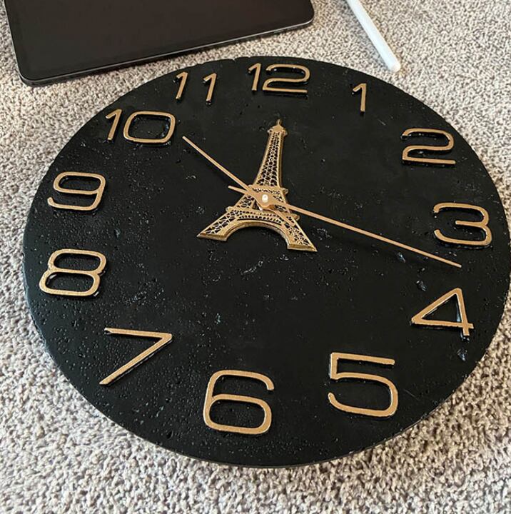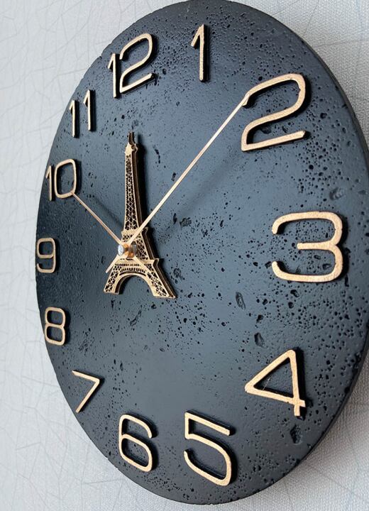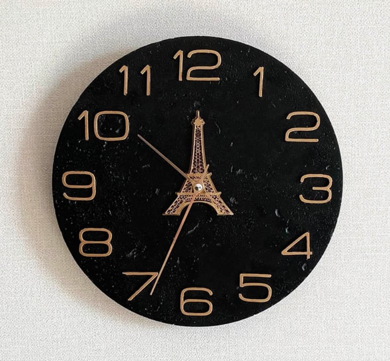 黒色の基盤にゴールドの文字が映える、エッフェル塔デザインの壁掛け時計です。