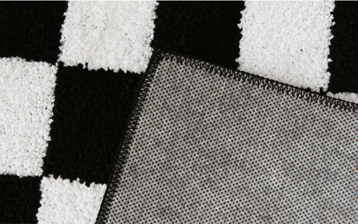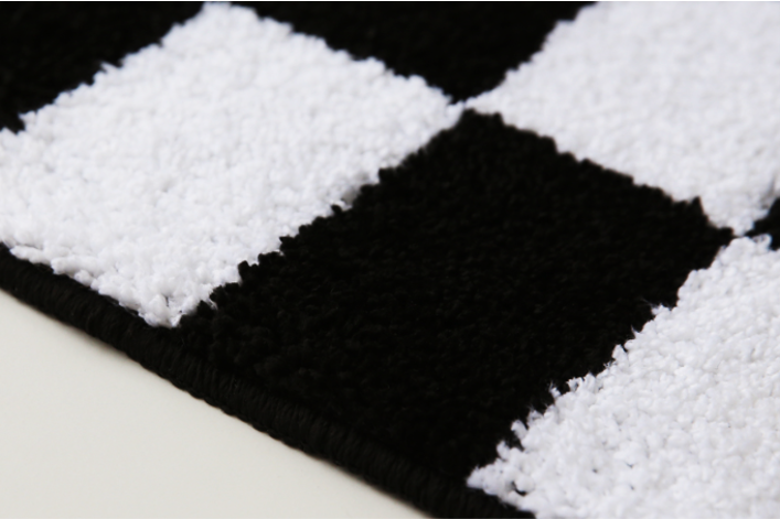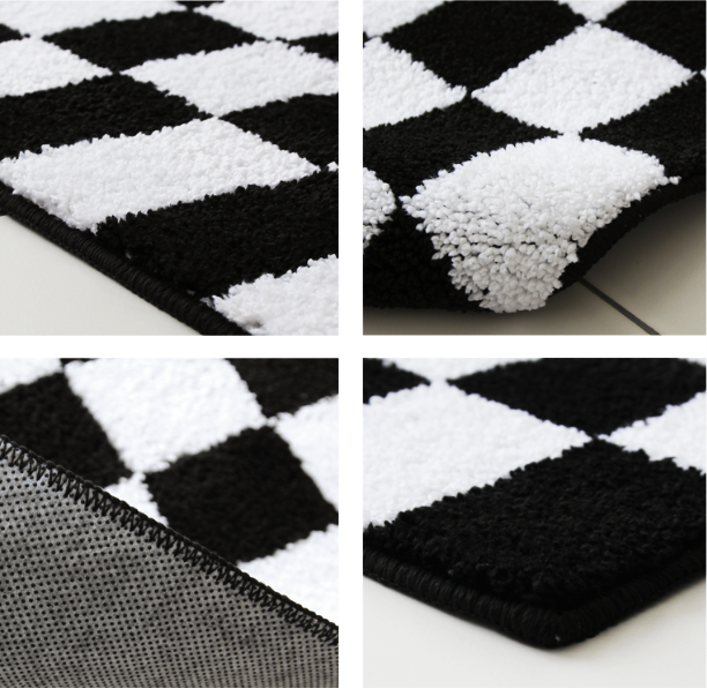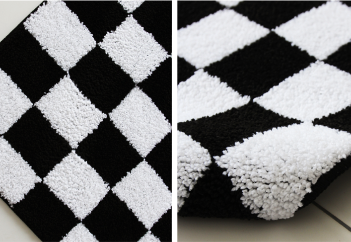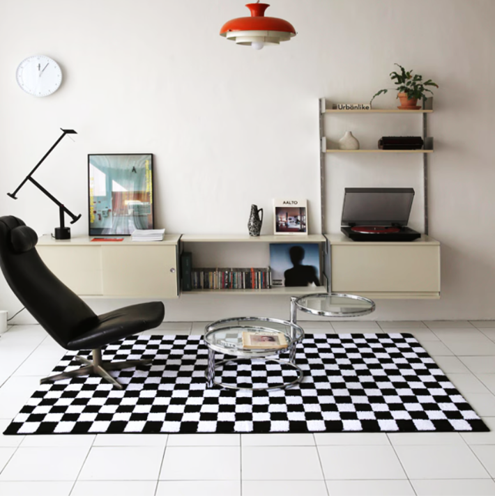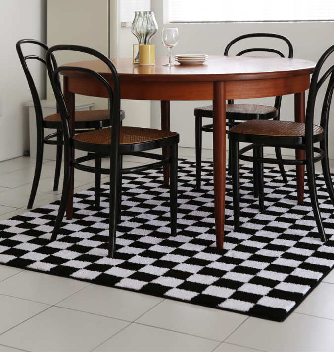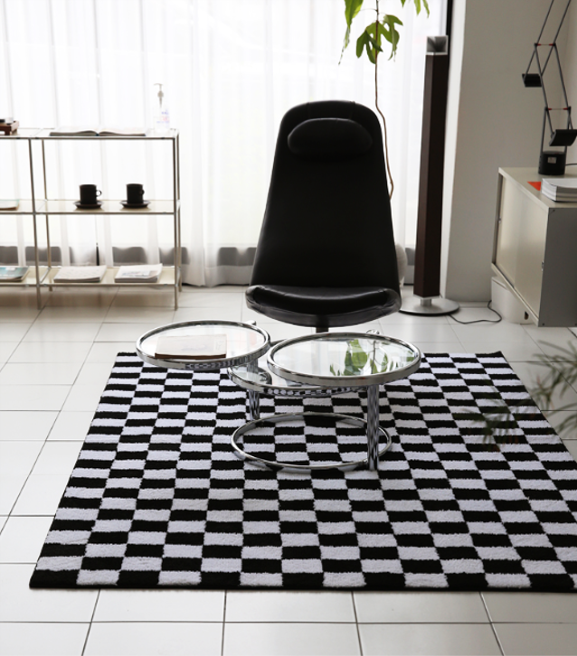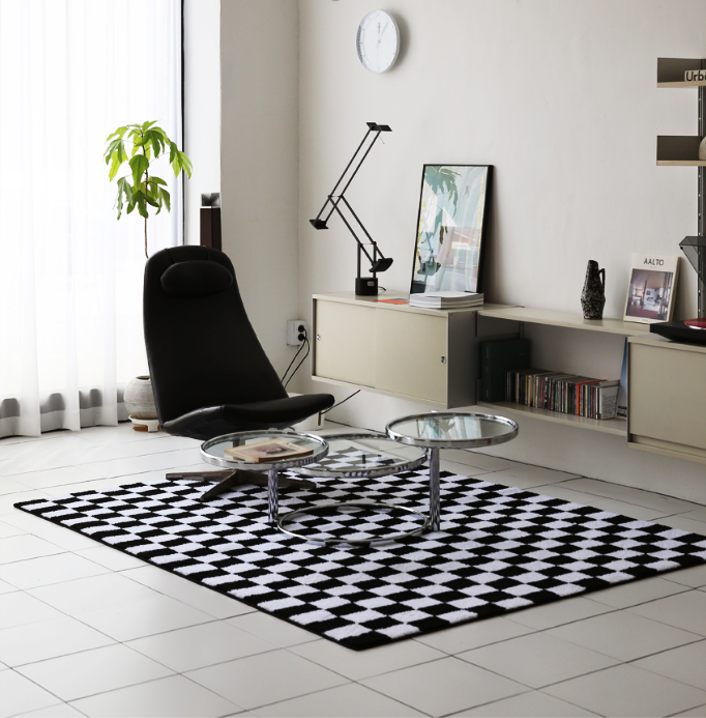 白黒チェック柄が映えるモダンなインテリアラグです。