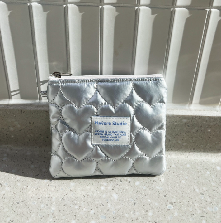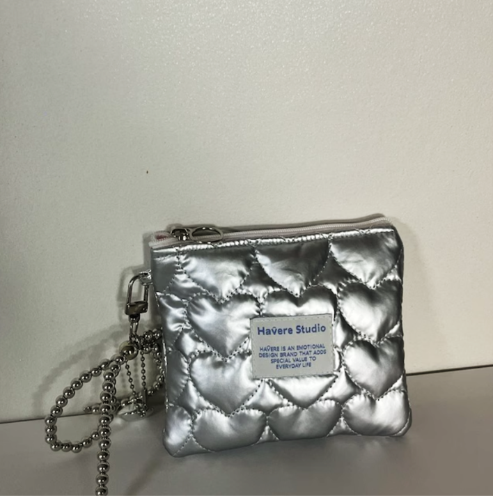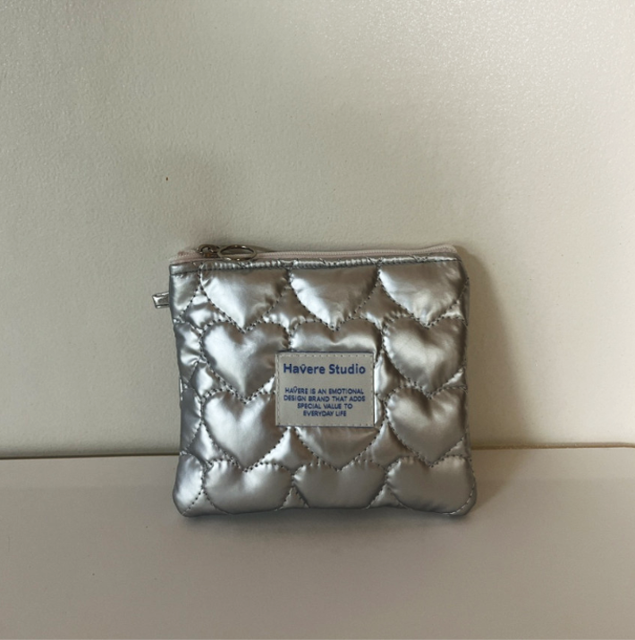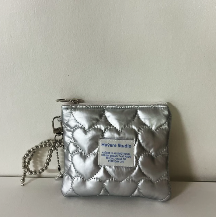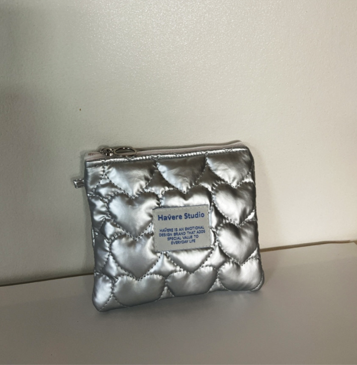 ・光沢シルバー×ハート柄の存在感:上品な光沢とハートキルティングが、かわいさとシックさを両立した印象を与えます。