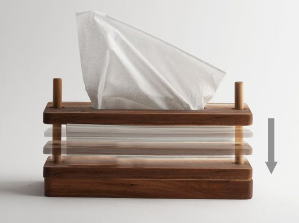 ティッシュを引き出すたびにフタが自然に下がり、最後の一枚まで美しく使える構造が魅力です。