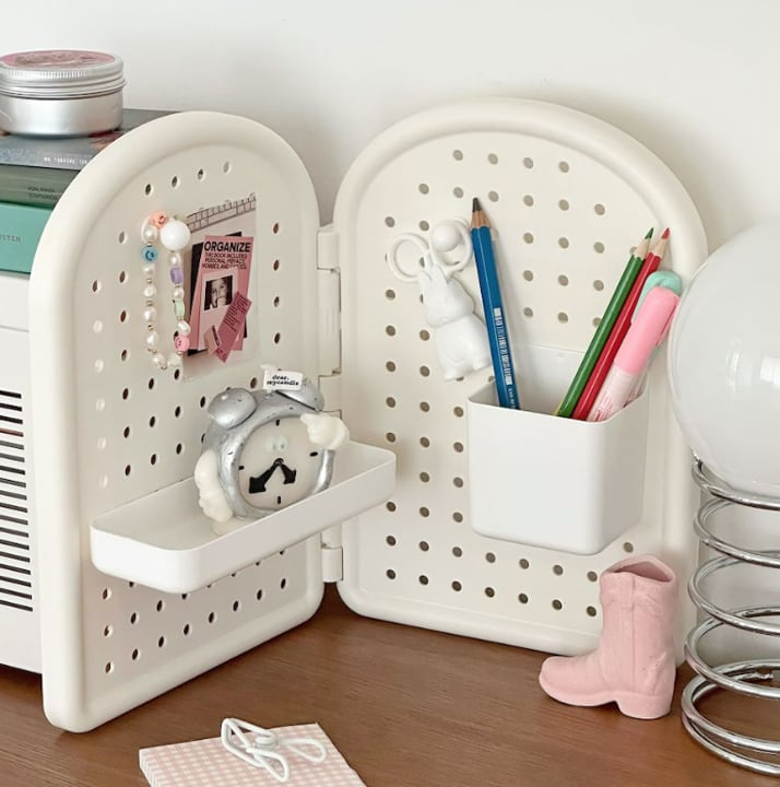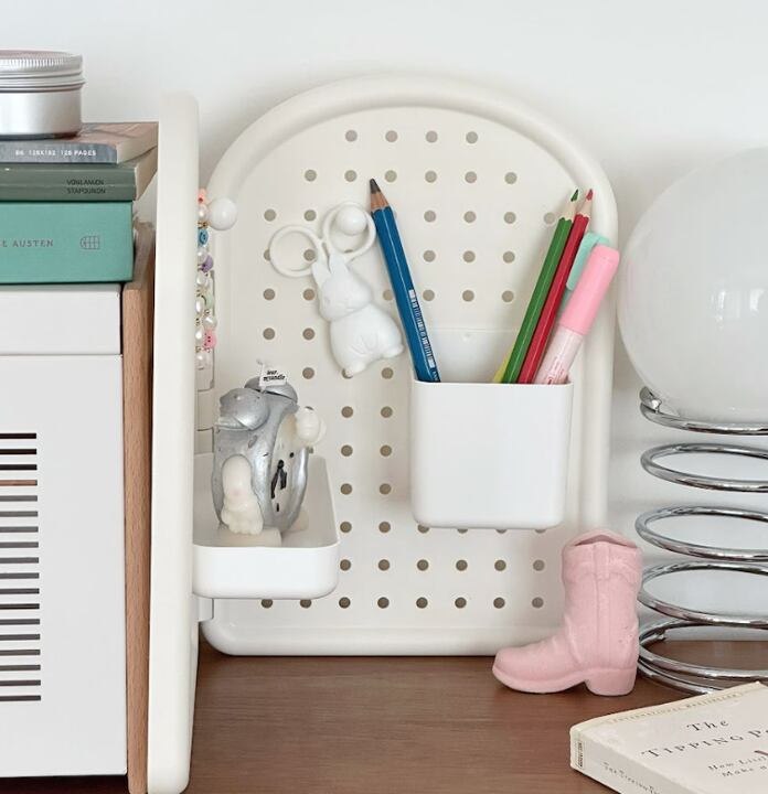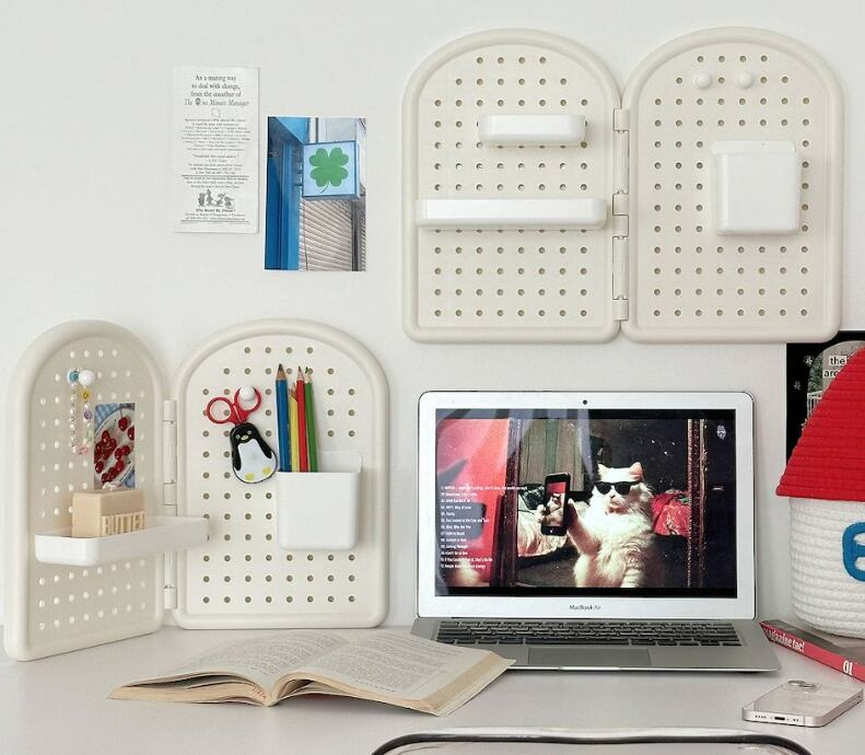 卓上の仕切りとしても壁掛け収納としても使え、デスク周りをすっきり整えられます。