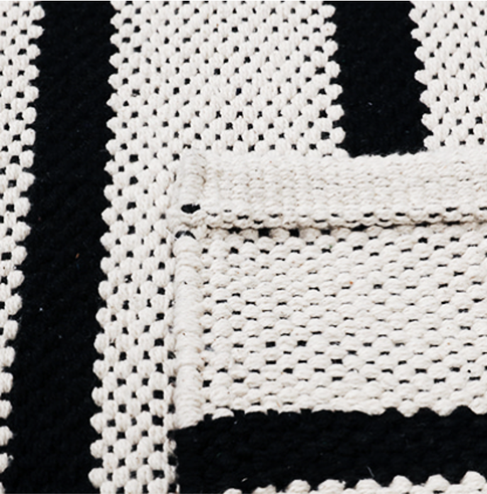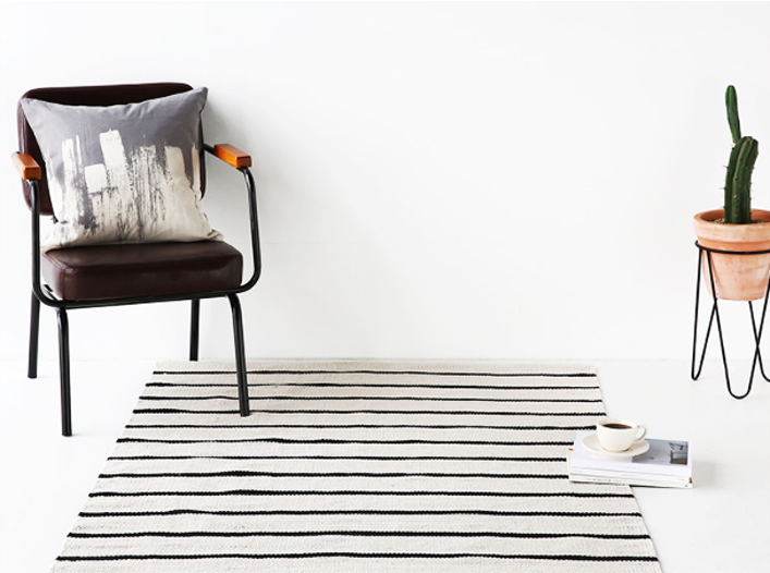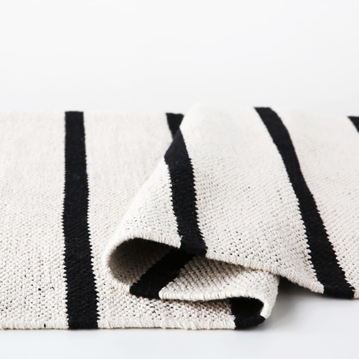 アイボリーの背景にブラックストライプを合わせた、すっきりとしたモノクロデザインが魅力のラグです。