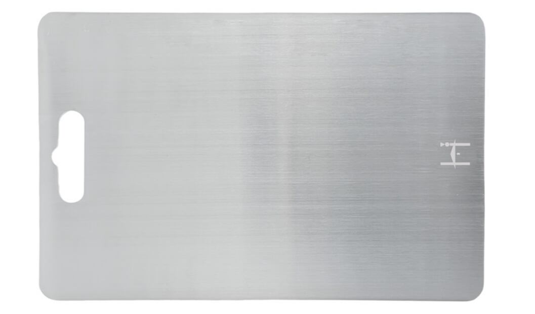 スタイリッシュなシルバーが映える、持ち手付きのステンレスまな板です。