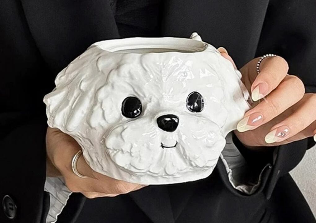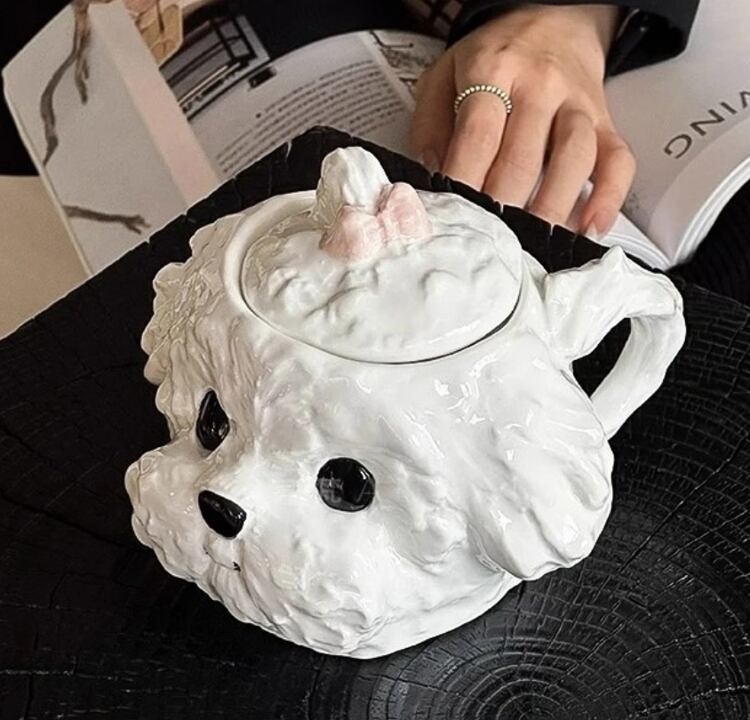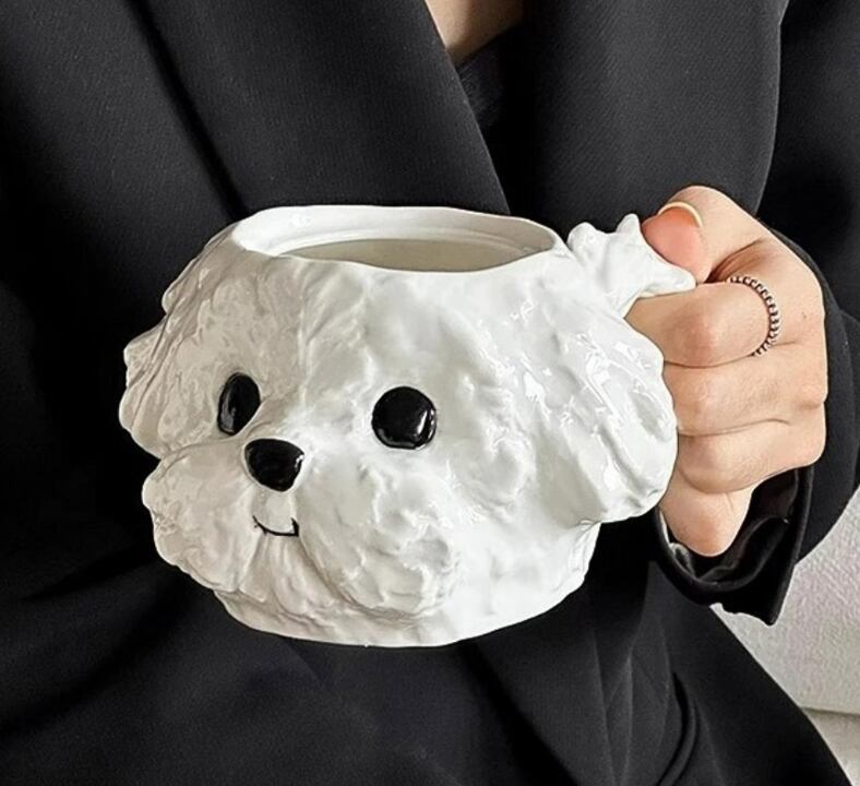 デザイン魅力:リボンのついた愛らしい犬顔デザインで、見ているだけで気分が和らぐ癒しマグカップです。