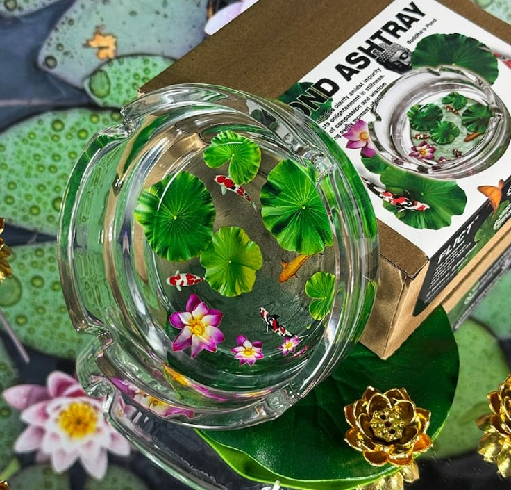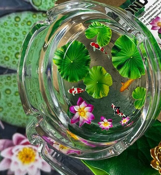 ハス池柄のプリントが印象的なガラス製灰皿トレイは、空間に個性を添えるユニークなデザインが魅力です。