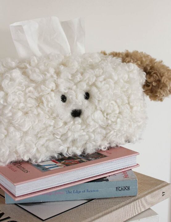 ふんわりしたイヌの顔がかわいい、もこもこ素材のティッシュケースカバーです。