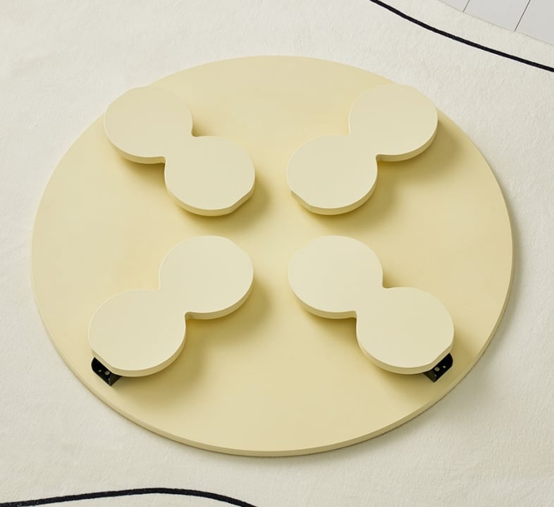 丸みのあるやさしいフォルムが特徴の折り畳みラウンドテーブルです。