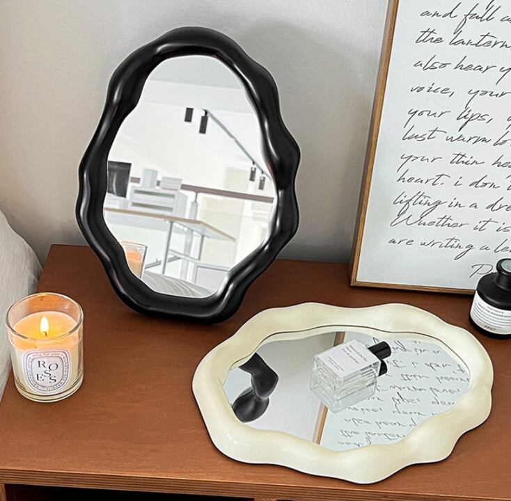 自由な曲線フレームが印象的で、置くだけで空間を彩るおしゃれなウェーブミラーです。
