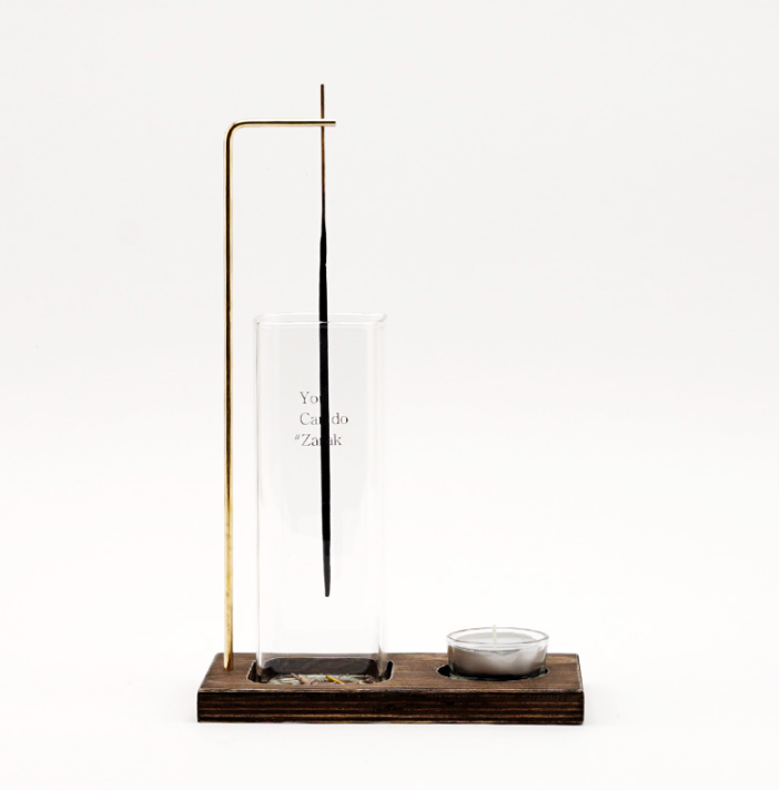 インセンススティックを取り付けられるガラスカップホルダーと、ティーライトキャンドルを入れられるホルダーがセットになった木製台座です。