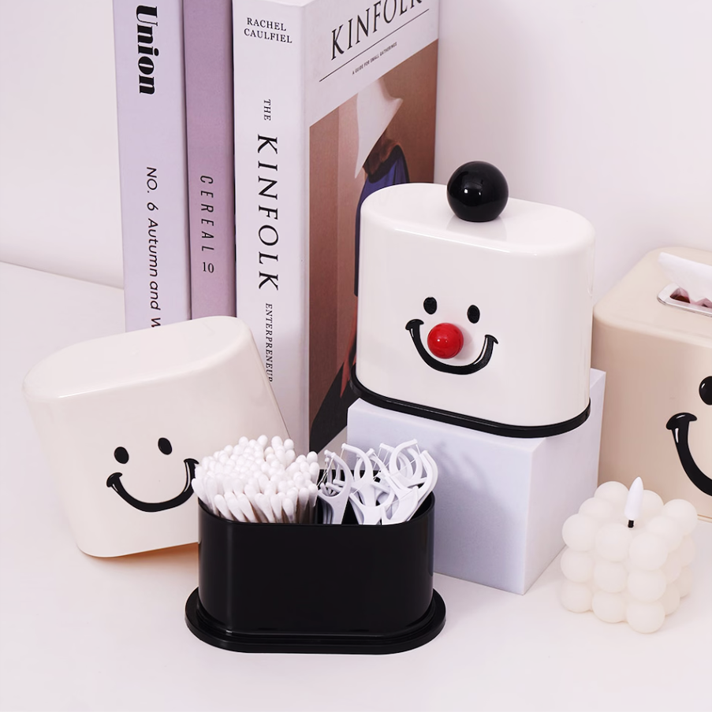 スマイルデザインが可愛い、小物収納に便利な綿棒・爪楊枝ケースです。