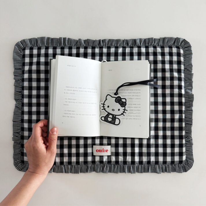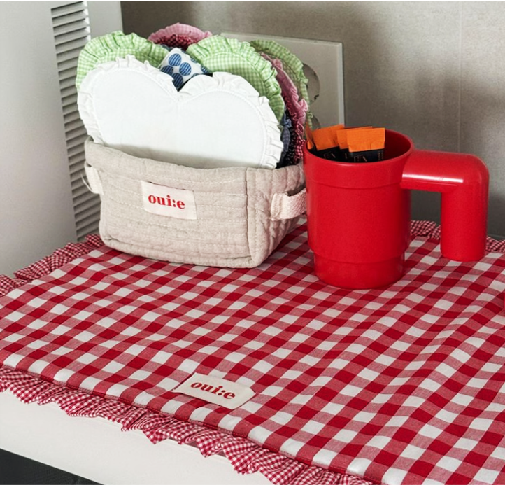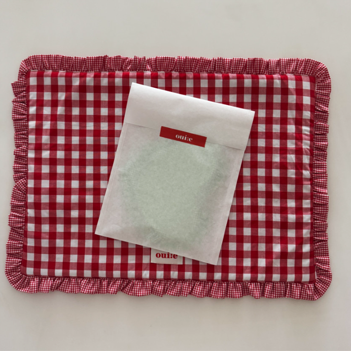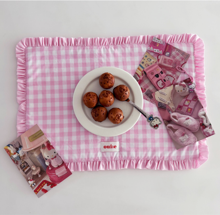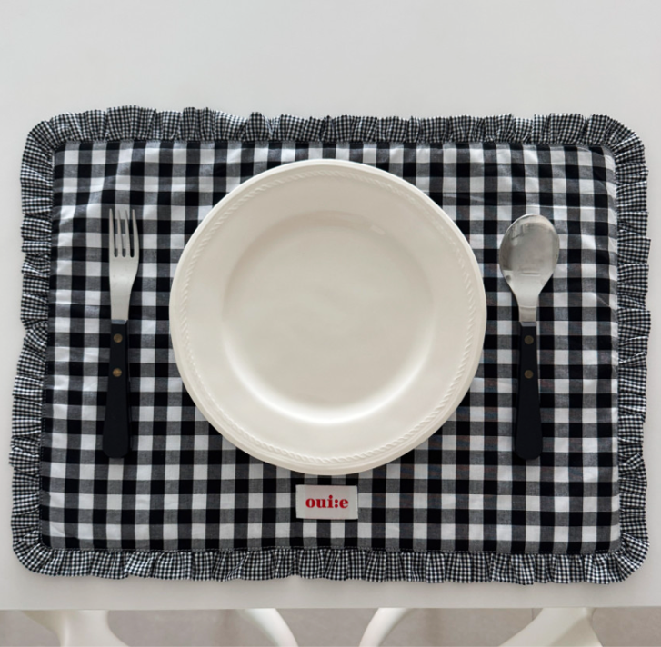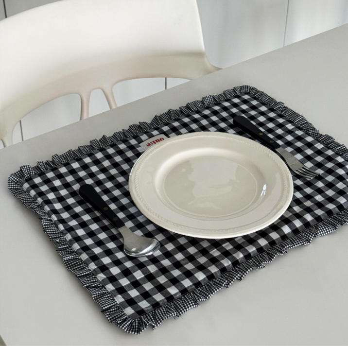 チェック柄とフリルが可愛い、インテリア映えするテーブルマットです。
